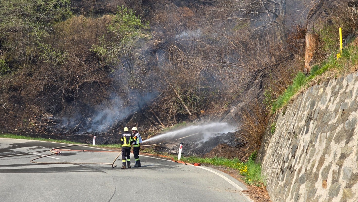 Die B111 zwischen St. Lorenzen und Maria Luggau bleibt gesperrt. Neben den Löscharbeiten sind Sicherungsmaßnahmen im steilen Gelände notwendig, um Steinschlaggefahr zu reduzieren.