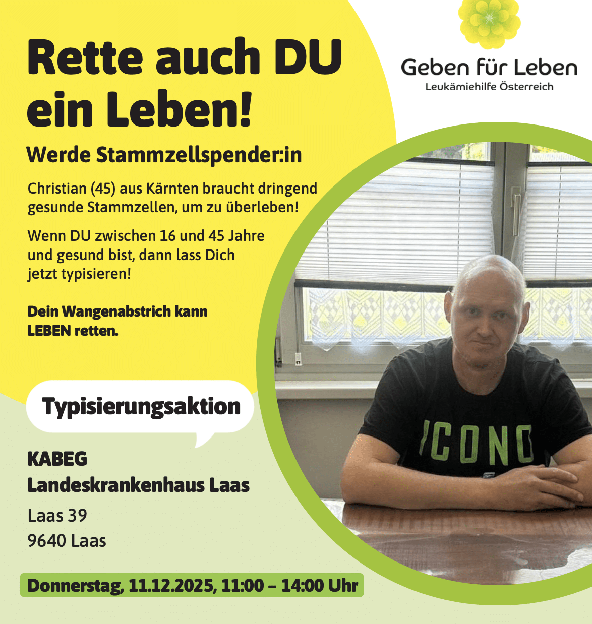 Jede Typisierung kann den entscheidenden Unterschied machen und Leben retten. Bei der Aktion am 11. Dezember 2025von 11:00 bis 14:00 Uhr im Foyer des Landeskrankenhauses Laas haben Interessierte die Möglichkeit, sich als potenzielle Stammzellspender:innen registrieren zu lassen. Unter dem Motto „Rette auch du Leben – werde Stammzellspender“ können Bürger:innen aktiv einen Beitrag leisten und zu echten Lebensrettern werden. Fertige Typisierungssets können auch zu Hause durchgeführt und anschließend in eine Sammelbox im Krankenhaus eingeworfen werden