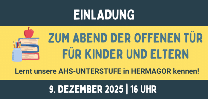 Am Dienstag, dem 9. Dezember 2025, öffnet die AHS-Unterstufe Hermagor ab 16 Uhr ihre Türen und lädt Kinder der 4. Volksschulklasse sowie deren Eltern herzlich ein, Schule hautnah zu erleben. Der Abend bietet die ideale Gelegenheit, die Schulform Gymnasium kennenzulernen und sich ein Bild vom Lernen und Leben am Standort Hermagor zu machen: Überblick, Orientierung und persönliches Kennenlernen stehen dabei im Mittelpunkt.