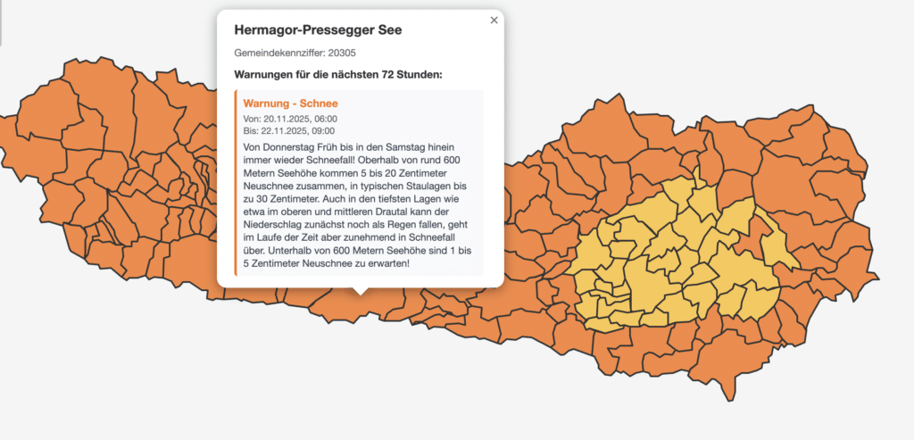 Der Wetterdienst Tauernwetter hat außerdem eine Wetterwarnung für insgesamt 133 Gemeinden herausgegeben, darunter auch die Gemeinde Hermagor Pressegger-See. Demnach ist oberhalb von rund 600 Metern Seehöhe mit 5 bis 20 Zentimeter Neuschnee zu rechnen.
