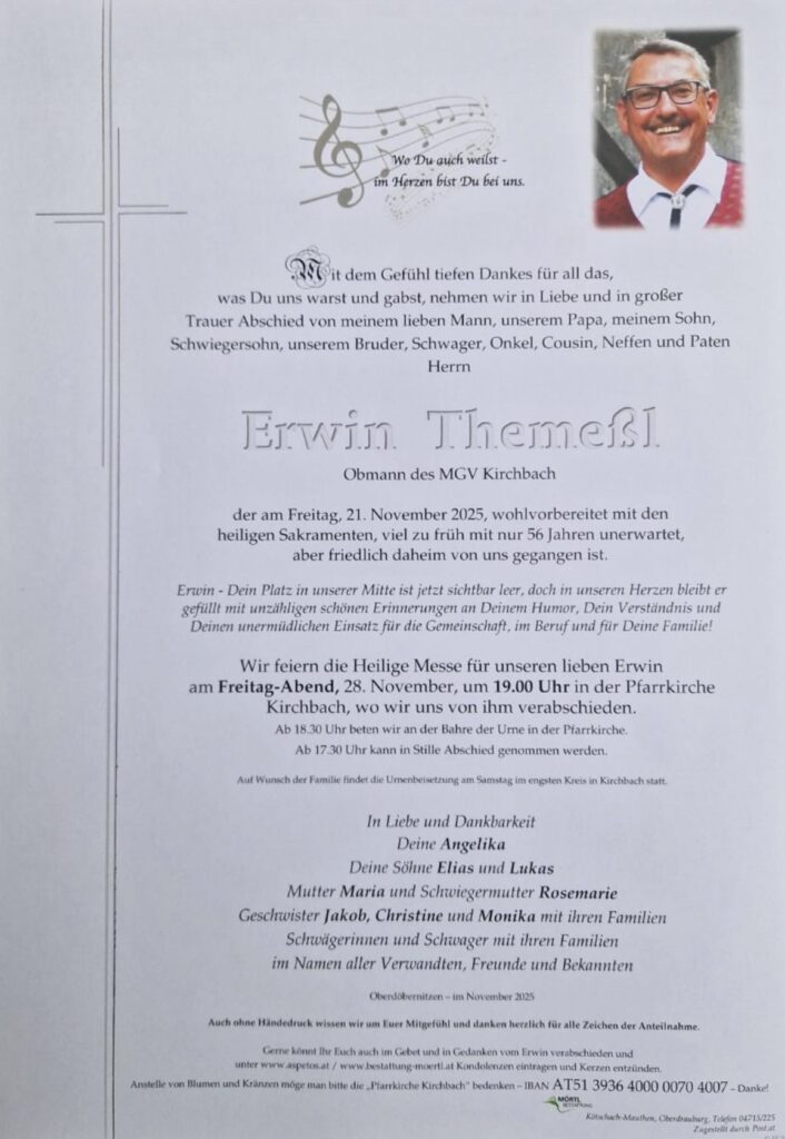 Erwin war seit 1991 Mitglied des Männergesangsvereins Kirchbach, von 1995 bis 1999 Obmann-Stellvertreter und seit 1999 – über ein Vierteljahrhundert – Obmann des MGV Kirchbach. Singen war für ihn nicht einfach ein Hobby – es war ein Teil seiner Identität. Mit außergewöhnlichem Engagement führte er den Chor und prägte ein Vereinsleben, das ohne ihn nicht denkbar gewesen wäre.
