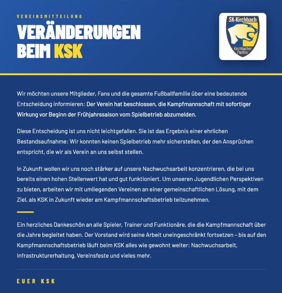 Gemeinsam mit umliegenden Vereinen arbeitet man bereits an einer partnerschaftlichen Lösung, um Jugendlichen weiterhin Perspektiven zu bieten – mit dem klaren Ziel, künftig wieder als KSK im Kampfmannschaftsbetrieb vertreten zu sein.
