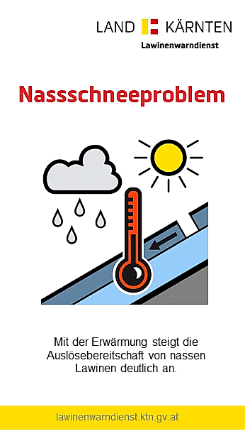 Markante Erwärmung in allen Höhen In den nächsten Tagen gelangt sehr milde Luft nach Kärnten. Mit dieser Erwärmung steigt die Auslösebereitschaft von nassen Lawinen deutlich an. Dies vor allem an sehr steilen Sonnenhängen und an Felswandfüßen unterhalb von rund 2400 m.