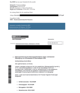 Internetbetrüger versenden derzeit vermehrt E-Mails, die angeblich vom Bundesministerium für Finanzen stammen. Darin wird behauptet, es würden offene Zahlungen bestehen, die umgehend zu begleichen seien. Den Nachrichten ist häufig eine gefälschte Zahlungserinnerung als Anhang beigefügt. Die Empfängerinnen und Empfänger werden unter Zeitdruck gesetzt und direkt zur Überweisung auf ausländische Konten aufgefordert. Das BMF warnt laufend vor solchen und ähnlichen Betrugsversuchen, welche über verschiedene Kommunikationskanäle wie SMS, E-Mail, Messenger-Dienste, Telefonanrufe und Social Media sowie über gefälschte Webseiten erfolgen.