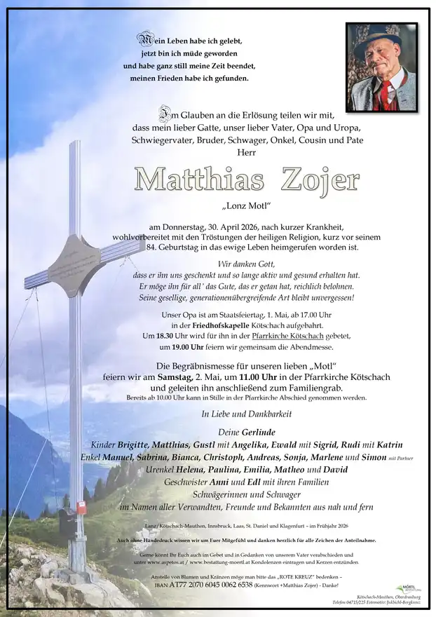 Aufbahrung am Freitag, dem 1. Mai, ab 17.00 Uhr in der Friedhofskapelle Kötschach.Gebet um 18.30 Uhr in der Pfarrkirche Kötschach und um 19.00 Uhr findet die gemeinsame Abendmesse statt. Die Begräbnismesse wird am Samstag, dem 2. Mai, um 11.00 Uhr in der Pfarrkirche Kötschach gefeiert, anschließend erfolgt die Beisetzung im Familiengrab.