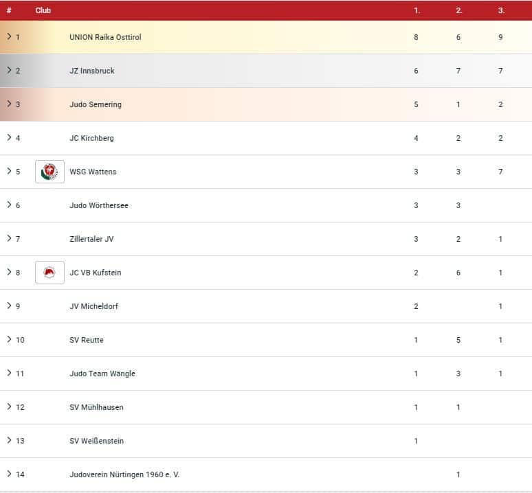 Nach den Bewerben der U10/U12 führte der Judo Semering überraschend die Vereinswertung mit vier Goldmedaillen an. Nach den Kämpfen der U14/U16 war der 3. Platz (bei 14 Vereinen) hinter Union Raika Osttirol und dem Judozentrum Innsbruck mit insgesamt fünf Goldmedaillen gesichert.