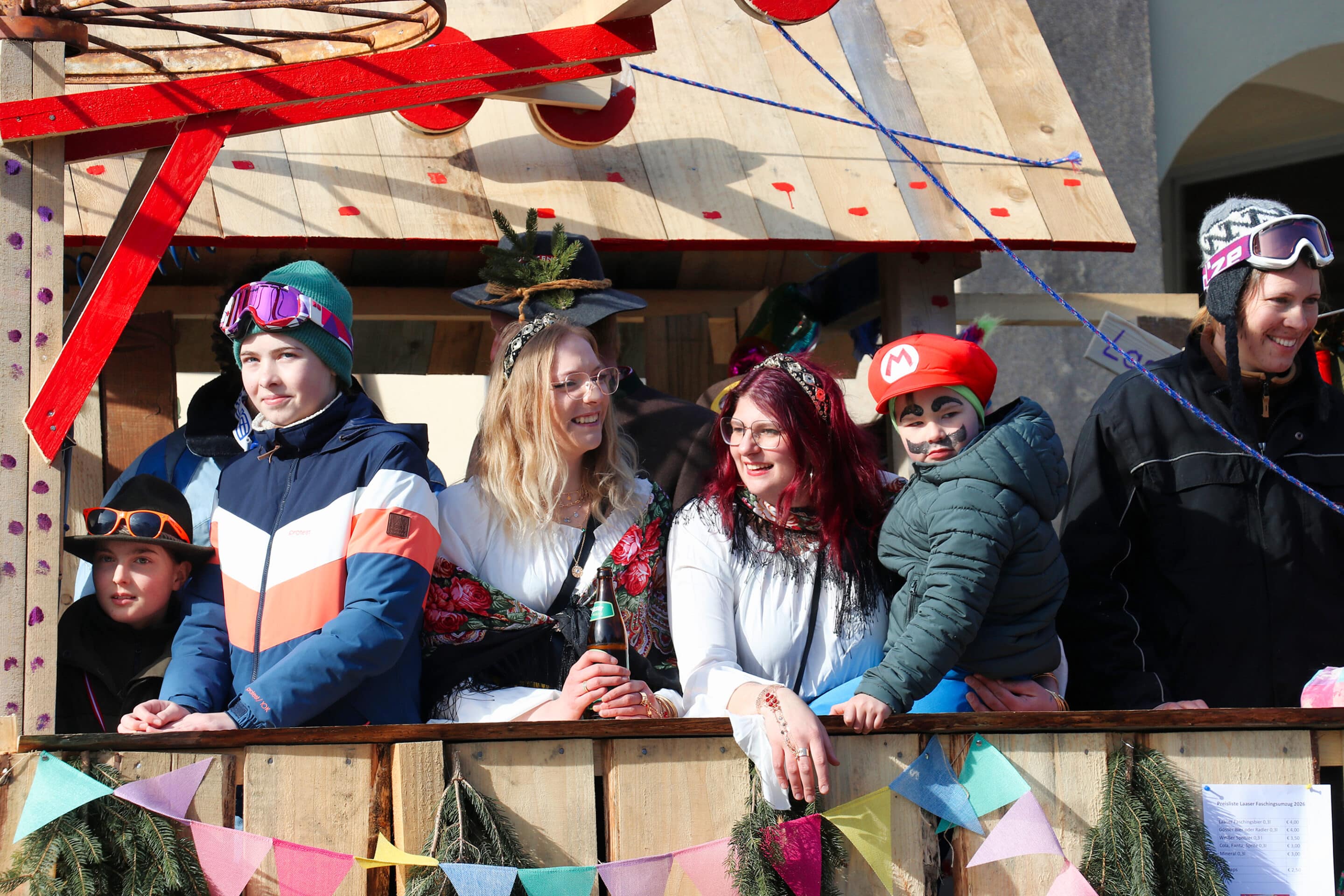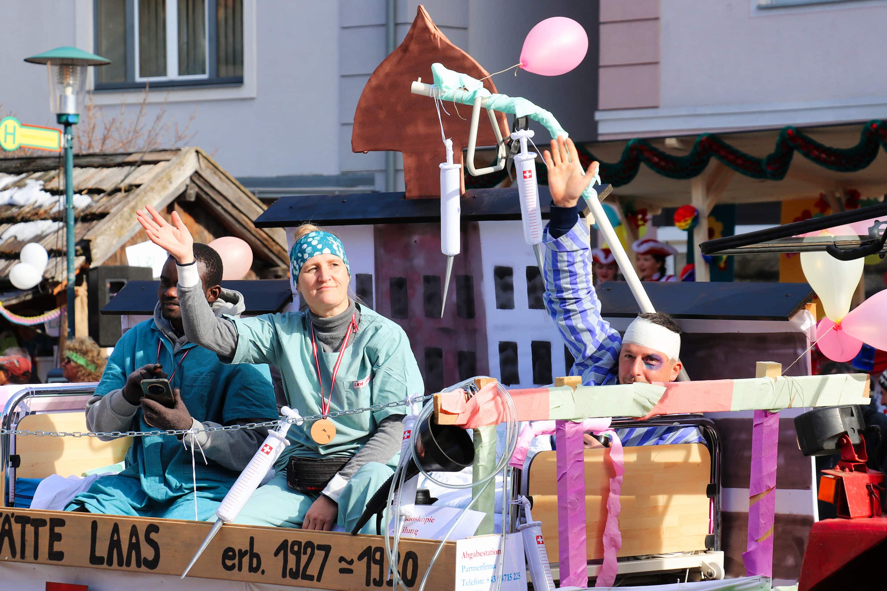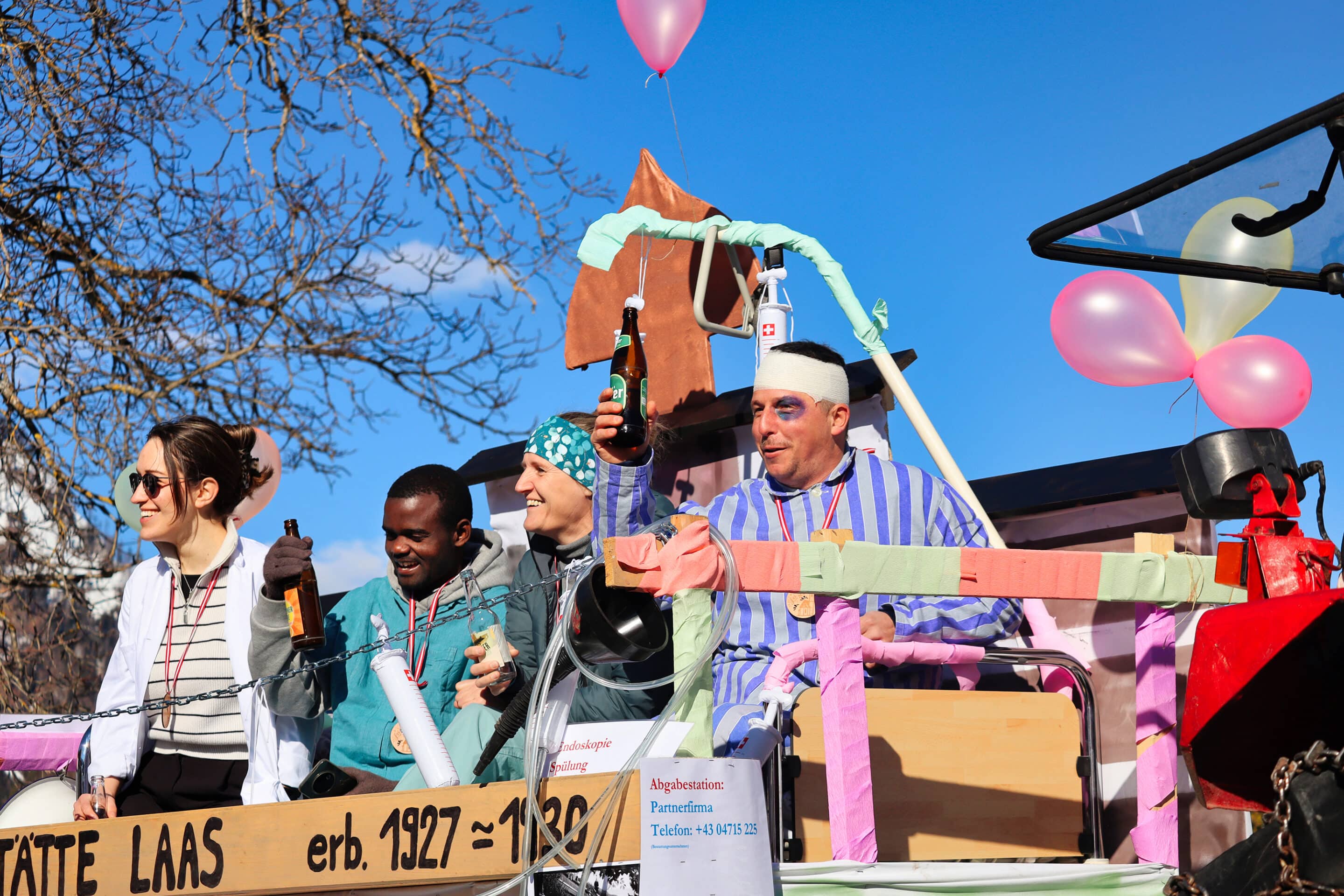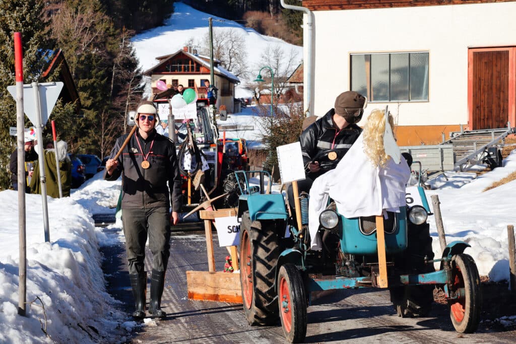 Exakt um 10:30 Uhr begann der Umzug in Laas. Insgesamt 17 bunt geschmückte Wägen rollten unter dem Motto „Laas anno dazumal“ über die Aue in Richtung Kötschach. Die kreativen Darstellungen reichten vom Laaser Krankenhaus über eine mobile Gemischtwarenhandlung, die Burschenschaft, den Laaser Lift und die alte Feuerwehr, der versteinerte Baum bis hin zu Guggi’s Pumuckl-Tischlerei, sowie Stangl’s Gasthaus. Angeführt wurde das närrische Treiben vom Laaser Prinzenpaar Daniel Luser und Anna Praster.