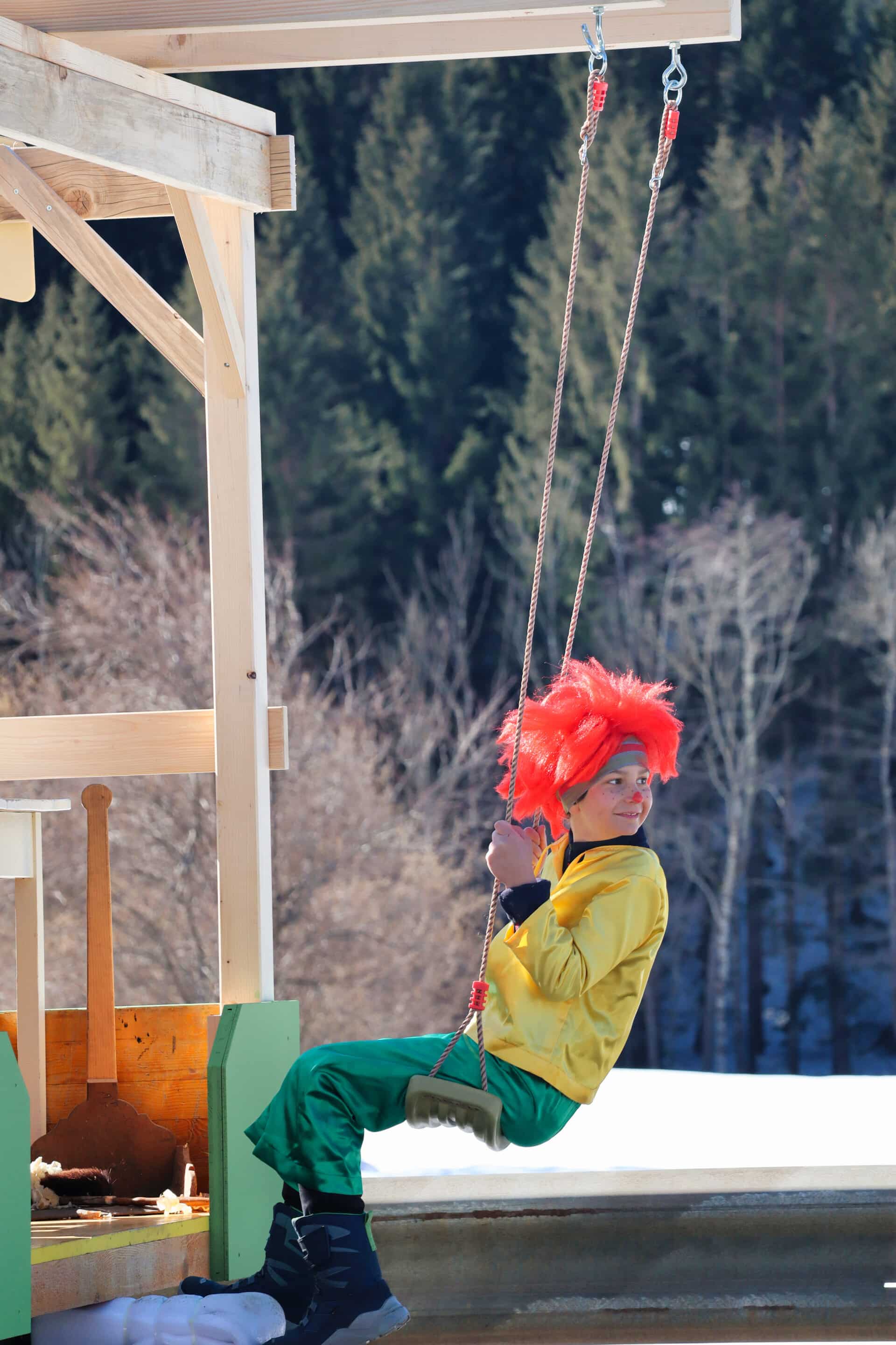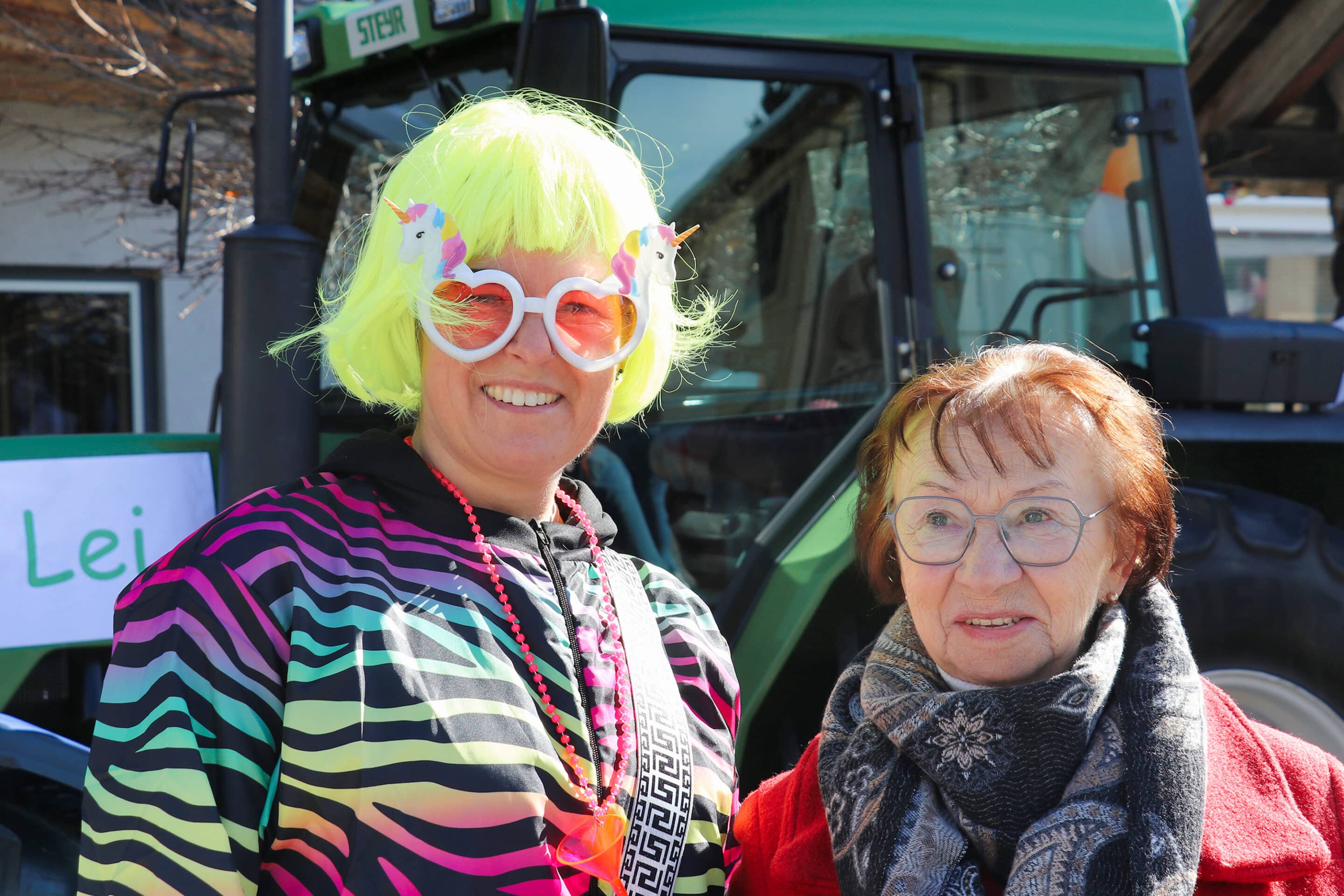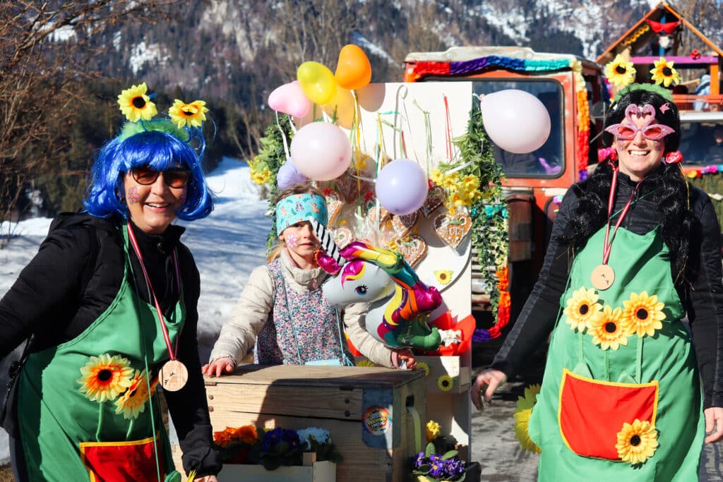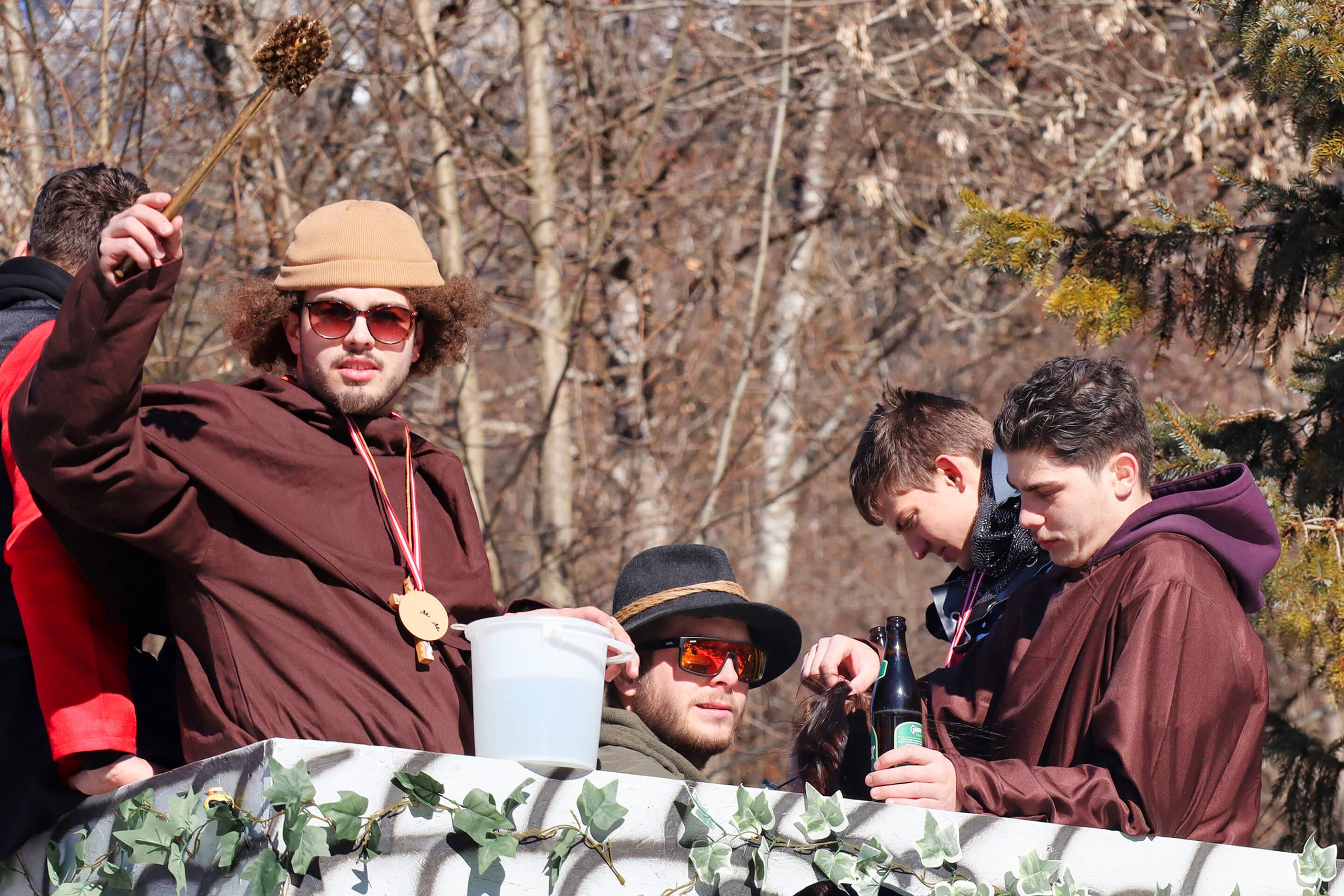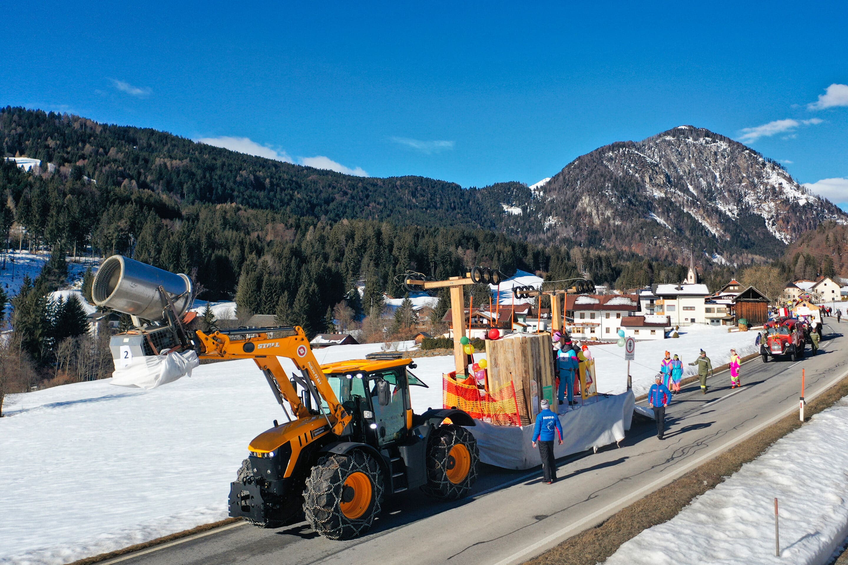 Exakt um 10:30 Uhr begann der Umzug in Laas. Insgesamt 17 bunt geschmückte Wägen rollten unter dem Motto „Laas anno dazumal“ über die Aue in Richtung Kötschach. Die kreativen Darstellungen reichten vom Laaser Krankenhaus über eine mobile Gemischtwarenhandlung, die Burschenschaft, den Laaser Lift und die alte Feuerwehr, der versteinerte Baum bis hin zu Guggi’s Pumuckl-Tischlerei, sowie Stangl’s Gasthaus. Angeführt wurde das närrische Treiben vom Laaser Prinzenpaar Daniel Luser und Anna Praster.
