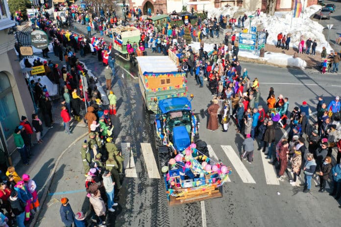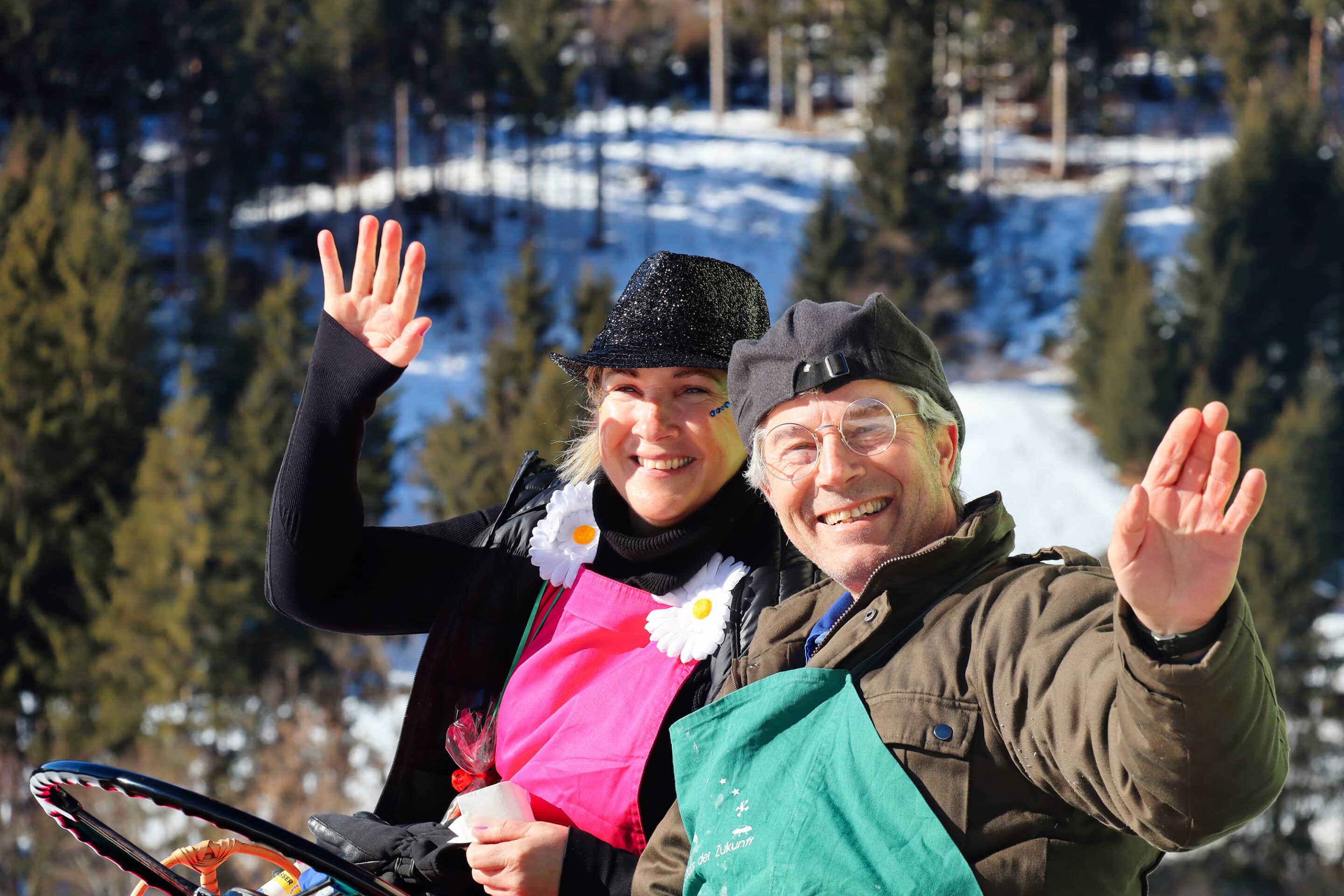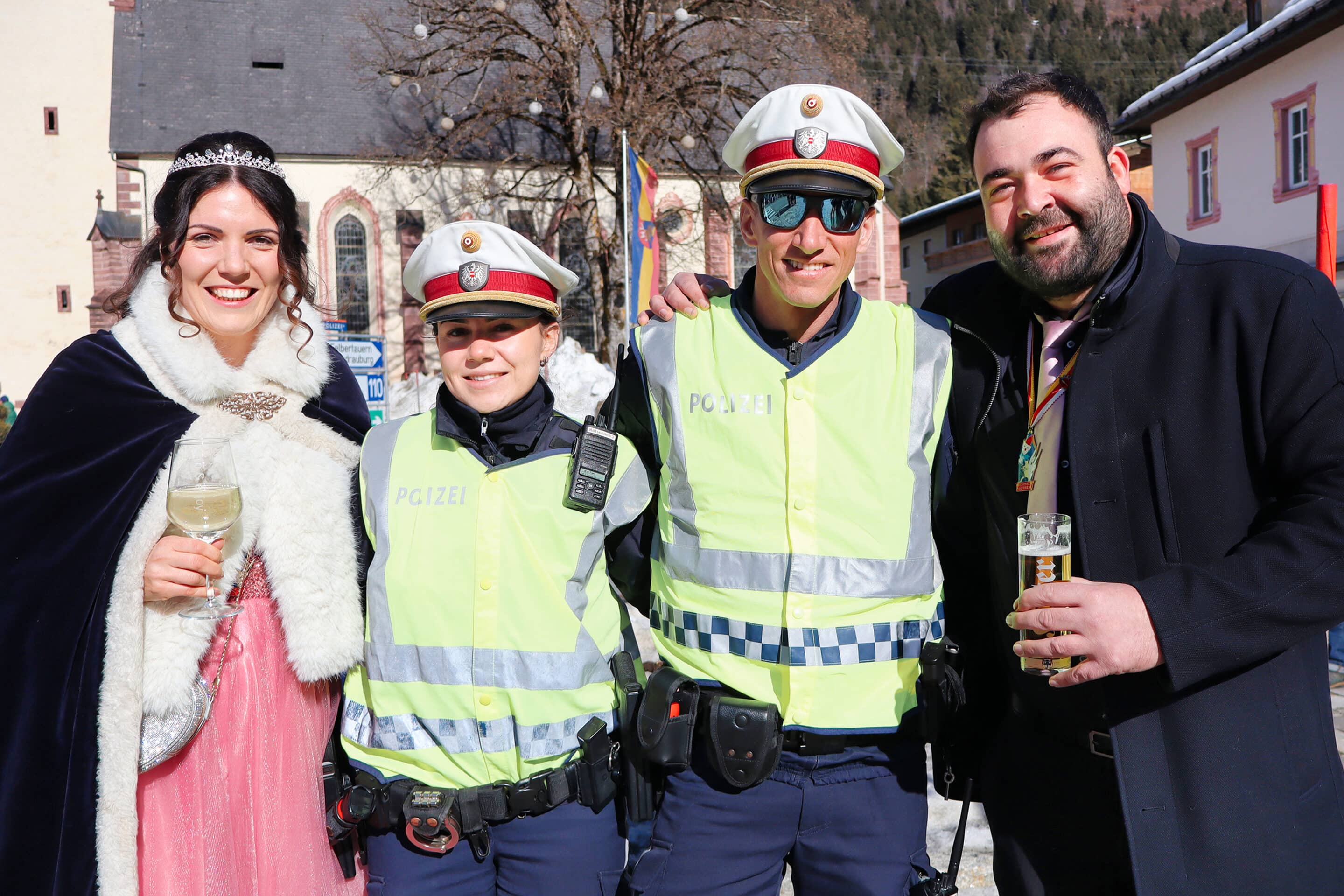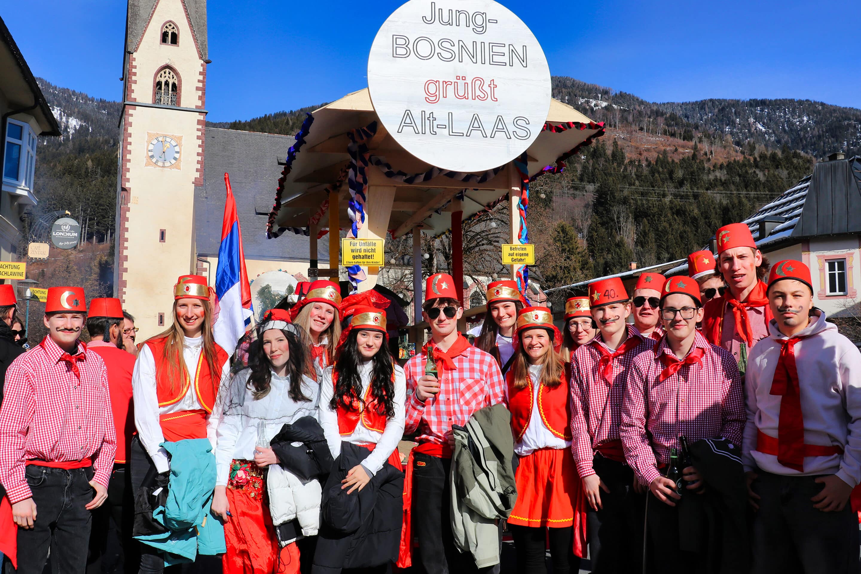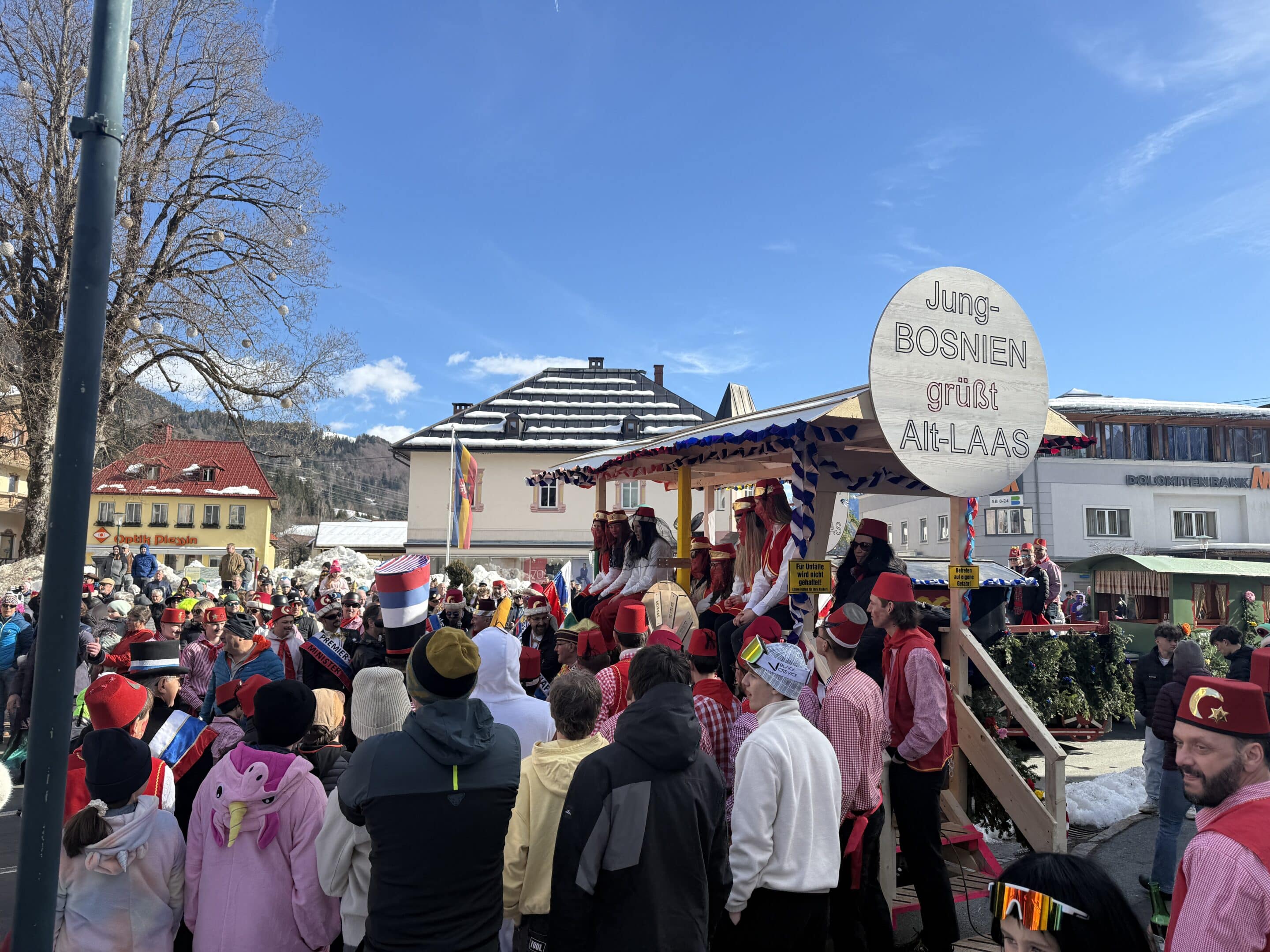 Um 13:13 Uhr wurden „Die Pittersberger“ in Kötschach lautstark willkommen geheißen. Ganz nach altem Brauch mussten die Laaser zunächst eine „Maut“ entrichten, um sich den Einzug in den Ort zu verdienen. Die „Bosniaken“ sorgten mit ihrem Haremswagen, dem „bosnischen Premierminister“ Christoph Zebedin samt seiner „Regierung“ aus Würmlach und einem herzlichen „Salem Aleikum“ für beste Stimmung. Stark vertreten war auch die Faschingsgilde Kötschach-Mauthen unter Präsident Günther Schreibmajer sowie mit Prinz Kai Buchacher, Ihrer Lieblichkeit Prinzessin Christina Patterer und dem Kinderprinzenpaar Niklas Kundert und Vanessa Unterweger. Im Anschluss folgte die traditionelle Faschingsansprache, bei der die Gilden aus Laas, Würmlach und Kötschach-Mauthen gemeinsam mit den Prinzenpaaren das närrische Treiben auf die Spitze trieben. Dabei stellte Karin Schmid – die erste Laaser Faschingsprinzessin aus dem Jahr 1976 – die einzelnen Wägen vor. Gemeinsam mit vielen hundert Zusehern wurde die fünfte Jahreszeit bis in den späten Nachmittag hinein ausgelassen gefeiert.