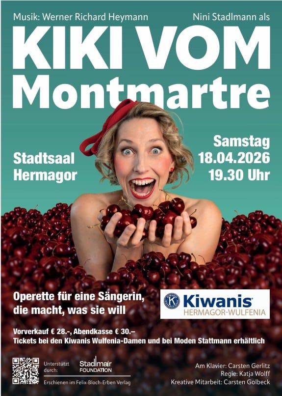 Die europaweit erfolgreiche Sängerin, Schauspielerin und Tänzerin Nini Stadlmann hat Gailtaler Wurzeln und lebt inzwischen in Radnig. Seit vielen Jahren ist sie in renommierten Theatern Österreichs und Deutschlands engagiert und kehrt regelmäßig für Gastspiele in den Stadtsaal Hermagor zurück. 2026 bringt sie mit „Kiki vom Montmartre“ erneut eine Operette auf die Bühne, die perfekt zu ihrer eigenwilligen, vielseitigen Art passt.