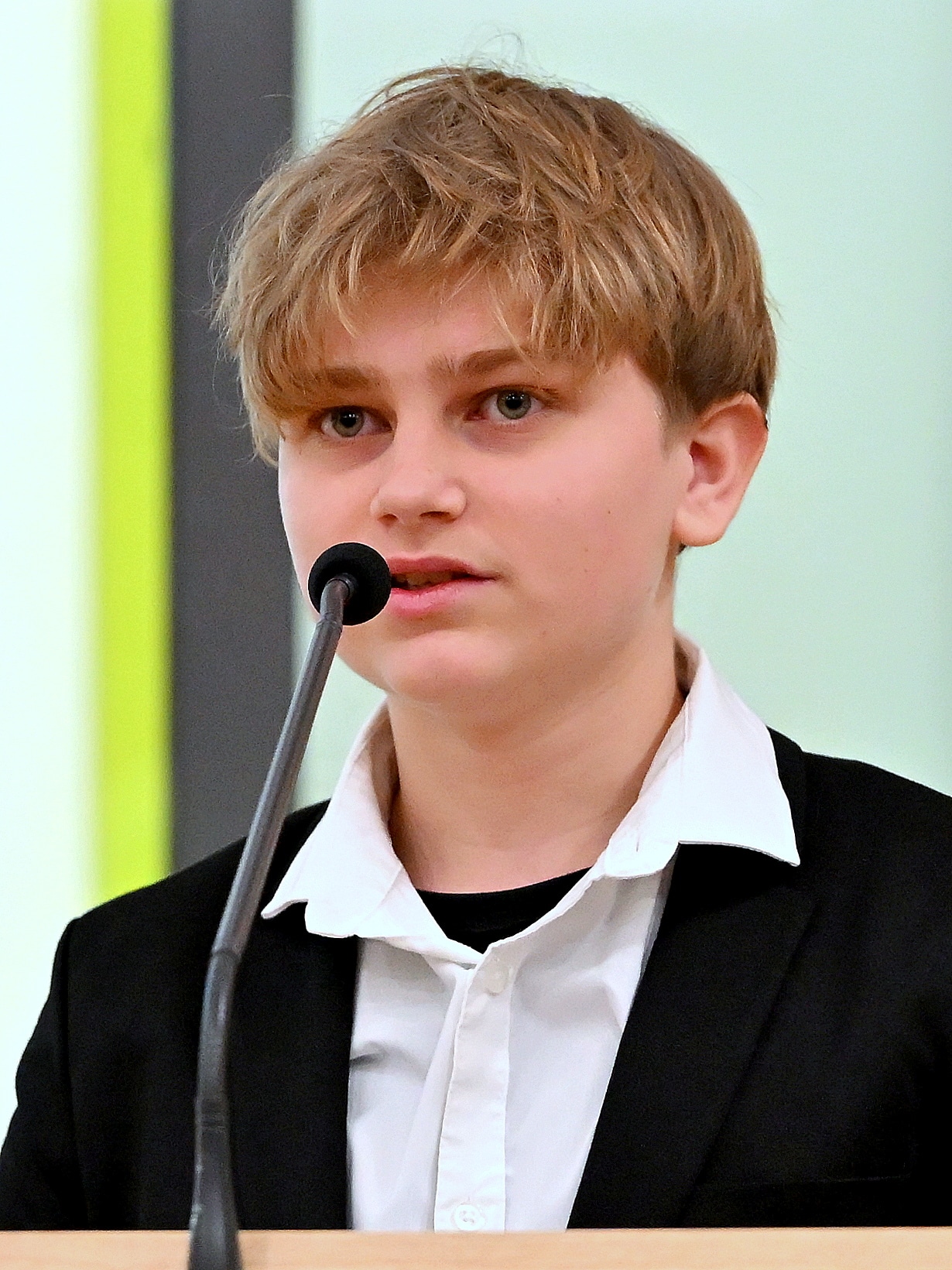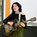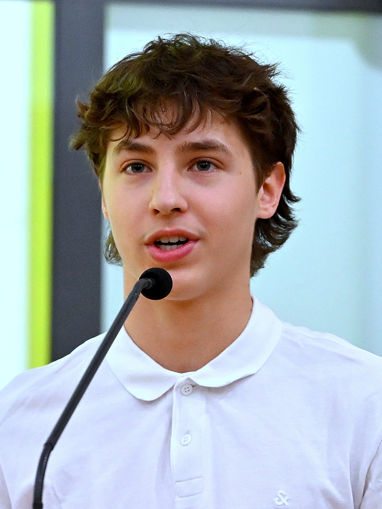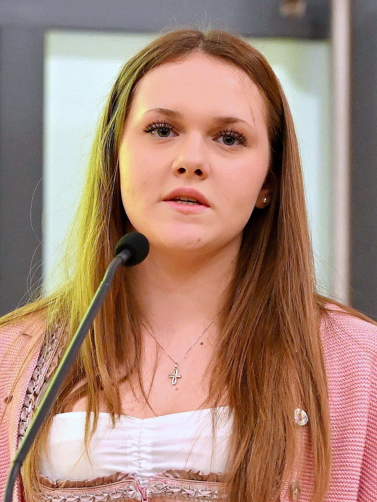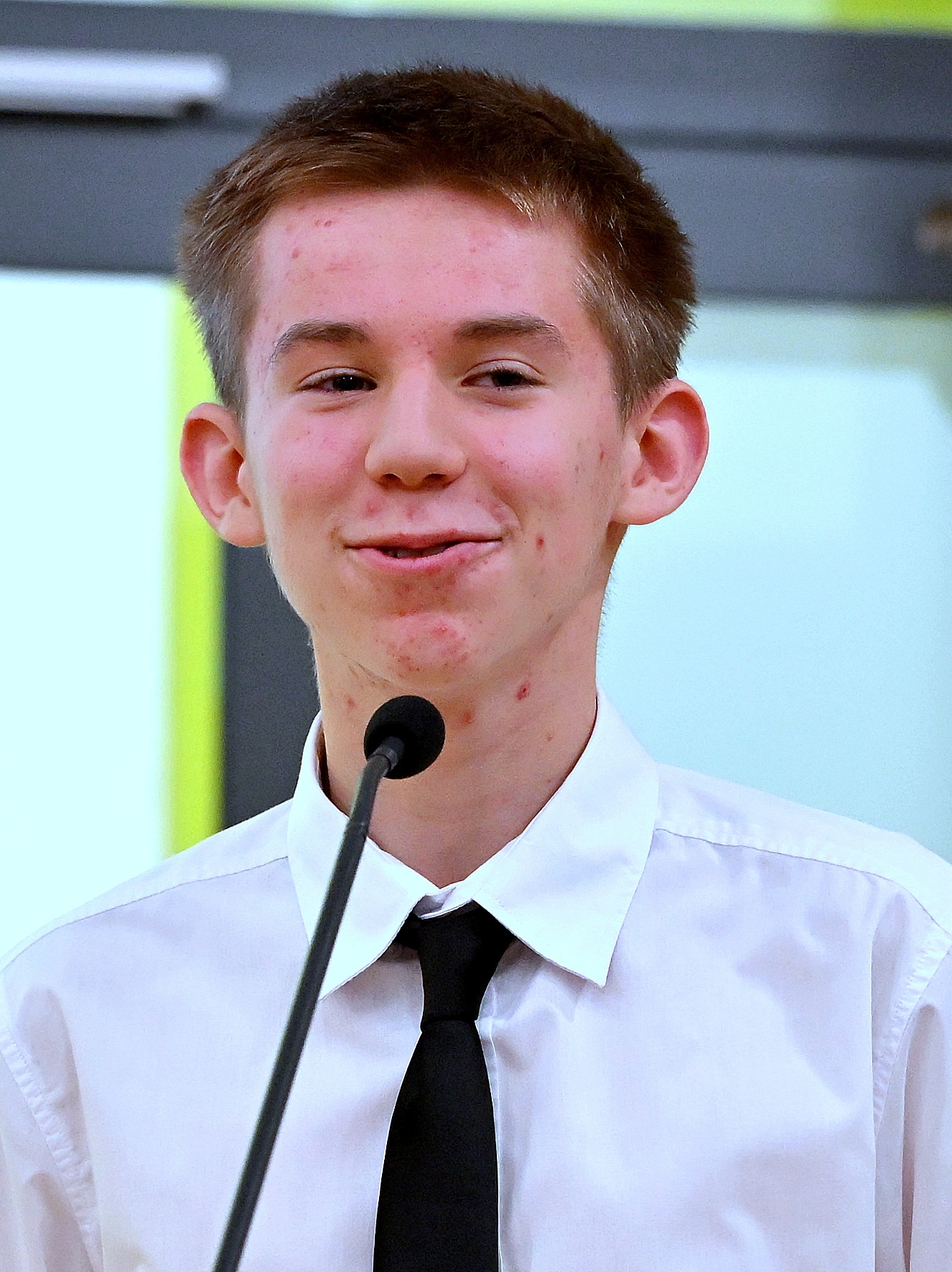 Die persönlichen Erzählungen der Schüler und Schülerinnen am Rednerpult wurden mit jeweils kreativ erstellten Powerpoint-Serien unterstützt und aufgelockert durch gesangliche Live-Sequenzen mit Gitarrenbegleitung durch die junge Gymnasiastin Nina Tschabuschnig (8a).