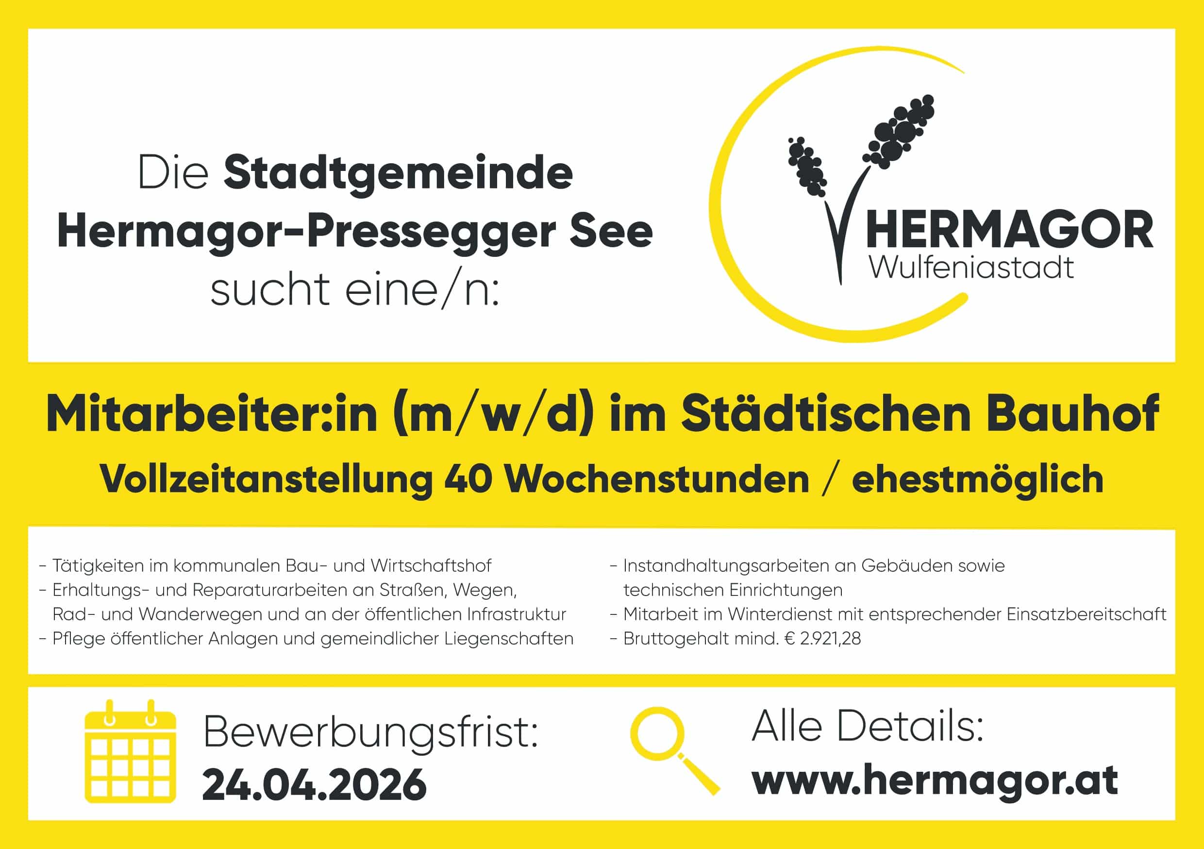 Wenn Sie an dieser Stelle interessiert sind, bewerben Sie sich bitte bei der Stadtgemeinde Hermagor-Pressegger See, z.Hd. Herrn AL Bernhard Resch, Wulfeniaplatz 1, 9620 Hermagor oder unter der E-Mail-Adresse bernhard.resch@hermagor.at bis spätestens 24. April 2026.