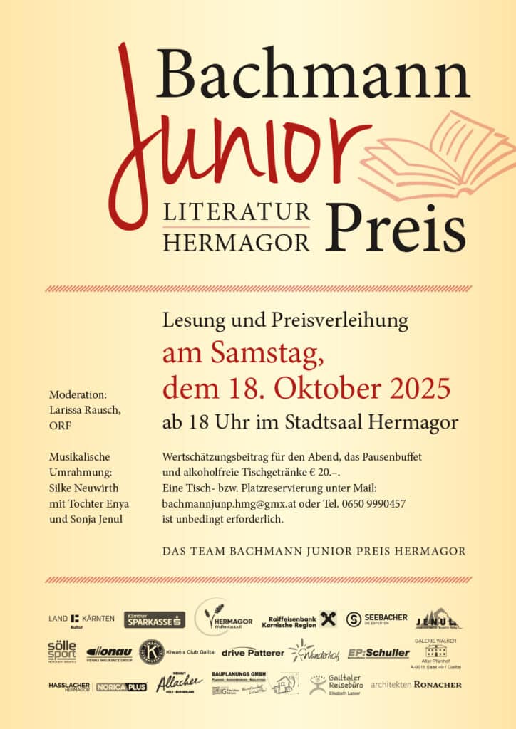 Nach dem Motto: „Die Wurzeln des Schreibens liegen in der Jugend!“ haben sich 2025 erstmals mehr als 200 mutige und talentierte junge Menschen aus dem europäischen Raum dem Thema „Unter einem fremden Himmel“ aus Ingeborg Bachmanns Gedicht „Schatten Rosen Schatten“ gewidmet, und ihre selbst erarbeiteten Texte dazu eingereicht. Die 15, durch die Jury ausgewählten und eingeladenen Finalisten sowie interessierte Gäste dürfen sich am 18. Oktober um 18 Uhr im Stadtsaal von Hermagor wieder auf einen äußerst spannenden und wortgewaltigen Abend mit Rahmenprogramm freuen. Leider stehen nur noch wenige freie Plätze zur Verfügung.