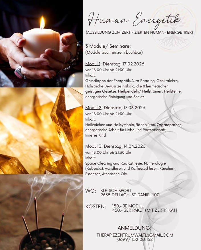 Dieses praxisorientierte Seminar vermittelt fundiertes Wissen in energetischer Heilarbeit, kombiniert mit spirituellen Methoden, die sowohl für den eigenen Lebensweg als auch für die Arbeit mit Klienten nutzbar sind.