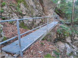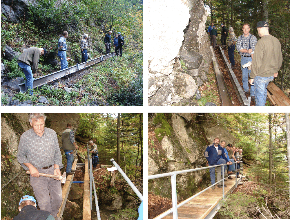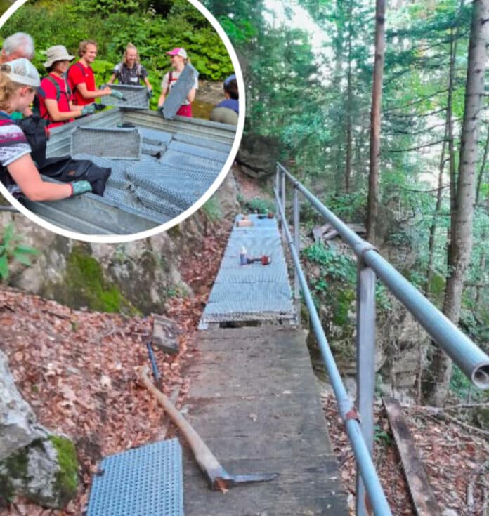 Das Renovierungsprojekt wurde von einem erfahrenen Bautrupp umgesetzt: Ewald Tiefenbacher, Gerhard Katschnig und Karl-Heinz Tiefenbacher arbeiteten mit präziser Handwerkskunst, um das Bauwerk zukunftssicher zu machen. Die Sorge um die Sicherheit der Brücke gehört damit der Vergangenheit an. Die Vorarbeit leistete Rudi Kis, der die Plattformteile vom abgetragenen Hochseilgarten zuschnitt und passgenau zurechtbog. An die dreißig recycelte Teile entstanden so und ermöglichten eine erste Kostenersparnis. Die zweite Ersparnis folgte, als junge Leute der Umweltbaustelle mit Holländern die schweren Eisenteile in den Graben transportierten – ein aufwändiger Hubschraubertransport konnte so vermieden werden.