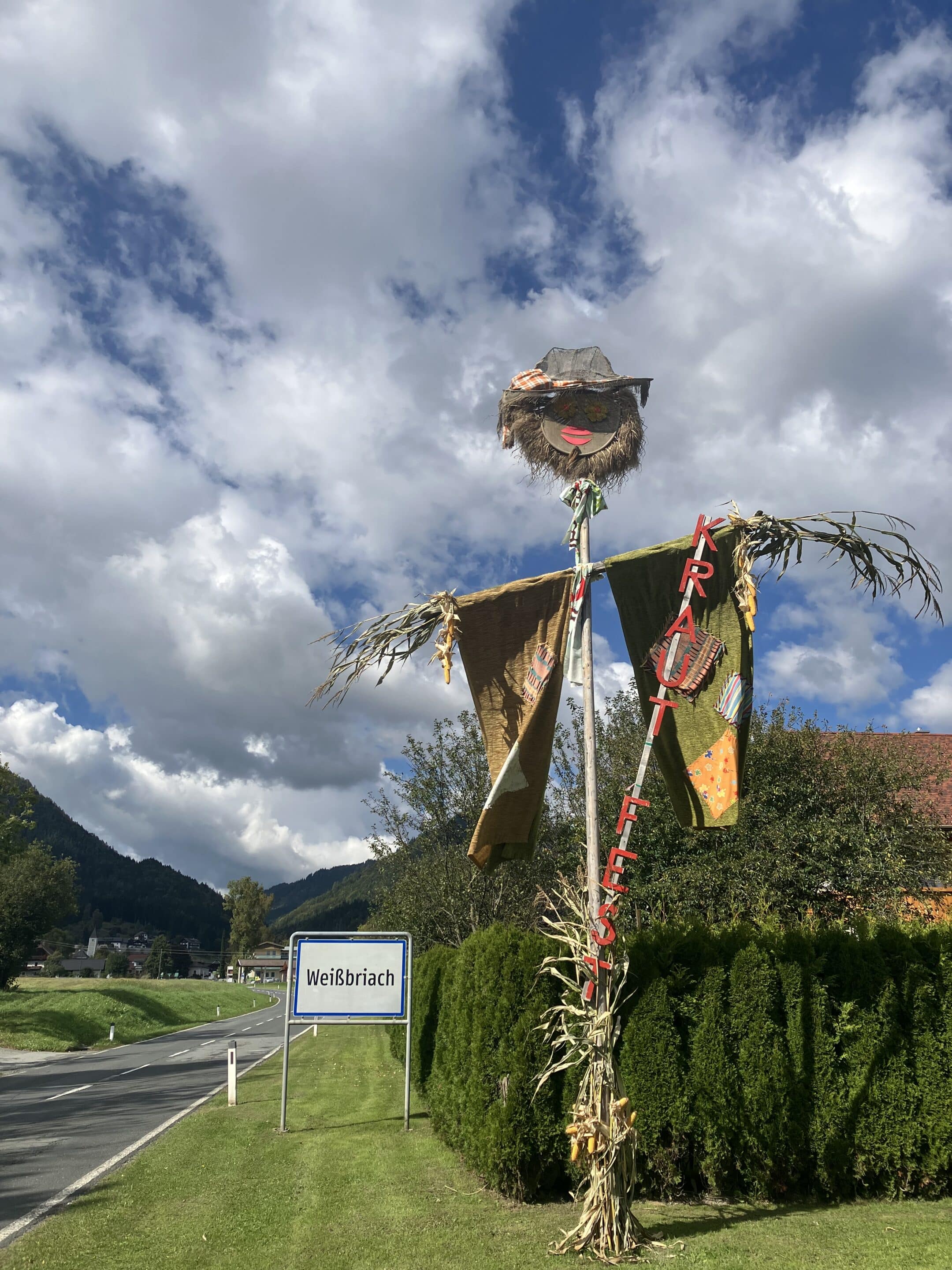 Ein besonderes Highlight erwartet die Besucher bereits bei der Anreise: Entlang der Bundesstraße durch Weißbriach entsteht rund um das Krautfest die farbenfrohe Krautscheuchenstraße. Mit viel Kreativität und Humor gestalten die Gitschtaler*innen liebevoll gebastelte Krautscheuchen – fantasievolle, oft witzige Vogelscheuchen aus Stroh und Stoff, die das Straßenbild schmücken und das Fest auf ganz besondere Weise einläuten. Die kunstvollen Figuren sind nicht nur ein Hingucker, sondern spiegeln auch die Verbundenheit der Bevölkerung mit dem Fest wider.