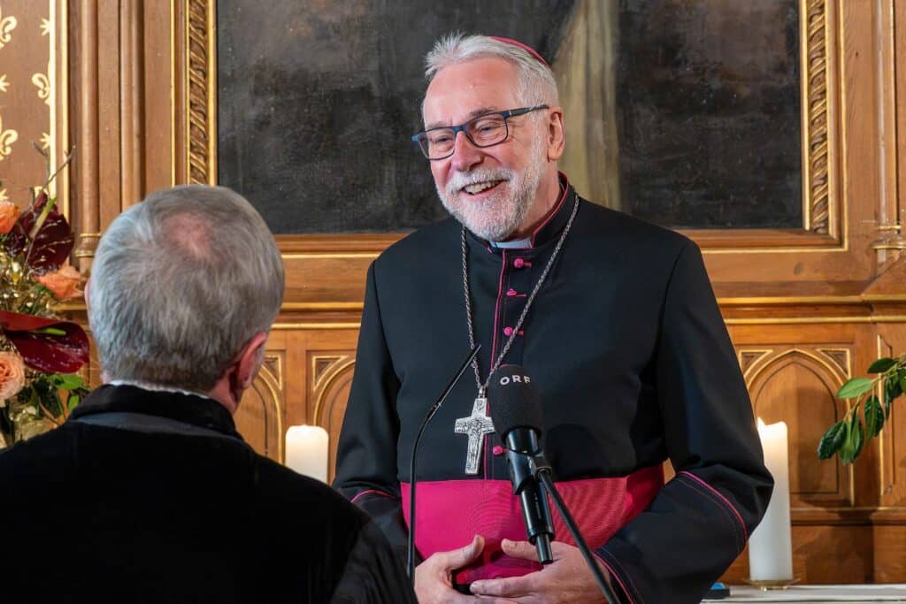 Landeshauptmann Peter Kaiser würdigte in seiner Ansprache die Verdienste Sauers und betonte, dass sich dieser, nicht nur als kirchlicher Würdenträger, sondern auch als Privatperson, fortwährend für den Dialog zwischen den unterschiedlichen Interessensgruppen eingesetzt hat. „Die heutige geistliche Feierlichkeit und die Atmosphäre stand für das, was Manfred Sauer über 24 Jahre aktiv vorgelebt hat: das Gemeinsame, den ökumenischen Austausch und die Überzeugung für die Schwachen einzutreten“, betonte Kaiser und erinnerte, an die vielen Herausforderungen, die das Land und die Kärntnerinnen und Kärntner in den vergangenen Jahren gemeinsam zu bewältigen hatten. Exemplarisch nannte Kaiser etwa die Flüchtlingskrise oder die Einschränkungen während der Covid-Pandemie. In seiner Funktion als Kulturreferent würdigte Kaiser die Verdienste Sauers für Kunst und Kultur. „Du wars ein kongenialer Partner und kritischer Gesprächspartner. Danke für deine Freundschaft und ich hoffe, dass du Kärnten und der Bevölkerung weiter erhalten bleibst“, schloss Kaiser seine Ansprache.