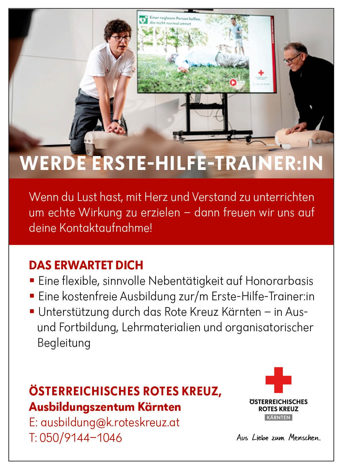 Gleichzeitig werden neue Erste-Hilfe-Trainerinnen und -Trainer gesucht. Der entsprechende Lehrgang steht grundsätzlich allen offen, die Freude am Helfen und am Arbeiten mit Menschen haben. Fabian und Daniel freuen sich über jede und jeden, der diesen Weg gehen möchte, und unterstützen mit ihrem Erfahrungsschatz aus dem Rettungsdienst.