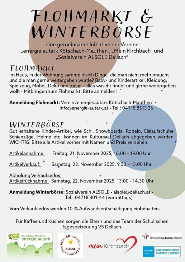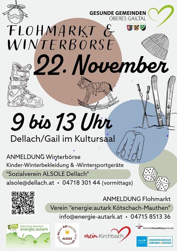 Gut erhaltene Kinder-Artikel, wie Schi, Snowboards, Rodeln, Eislaufschuhe, Schianzüge, Helme etc. können im Kultursaal Dellach abgegeben werden. WICHTIG: Bitte alle Artikel vorher mit Namen und Preis versehen!