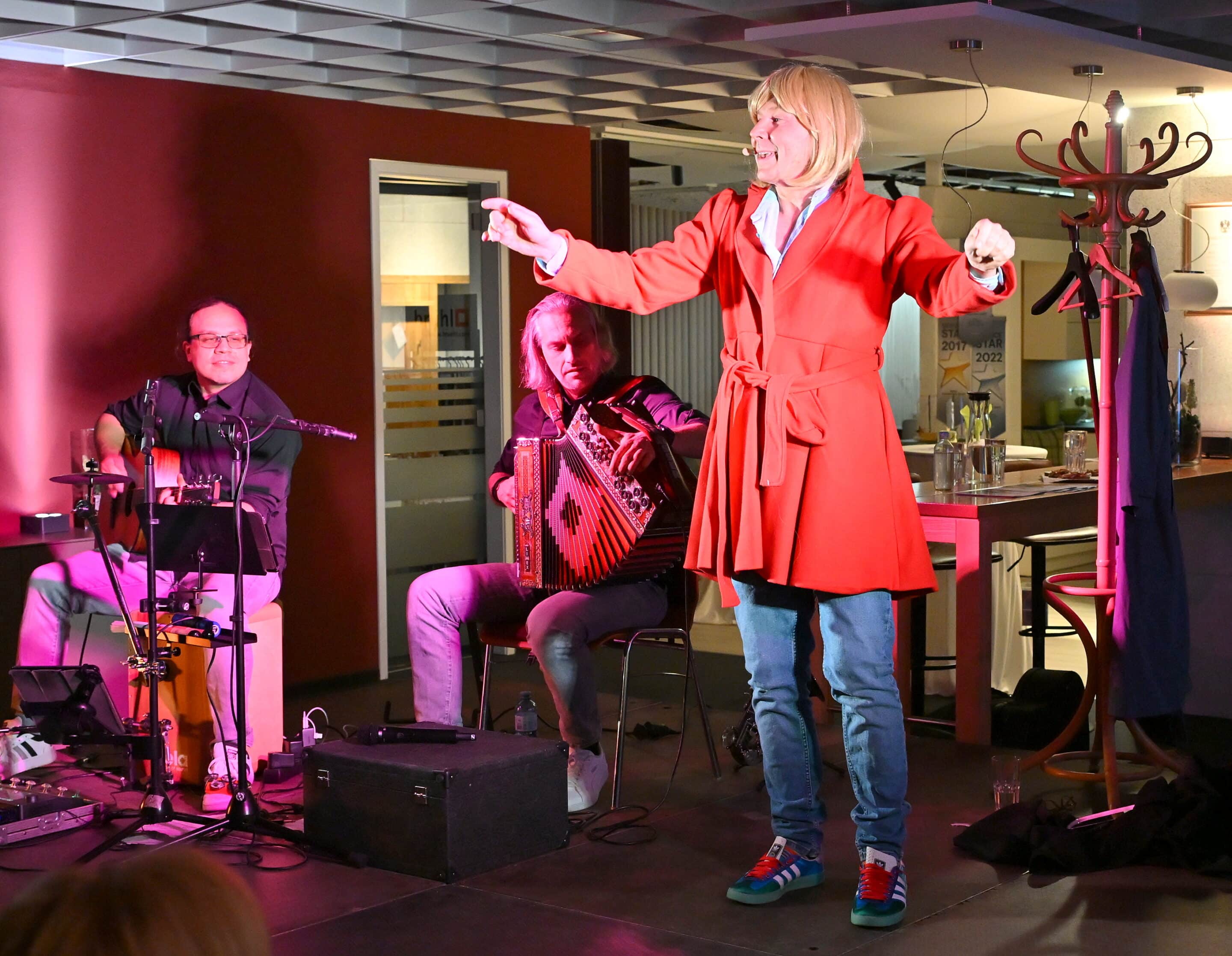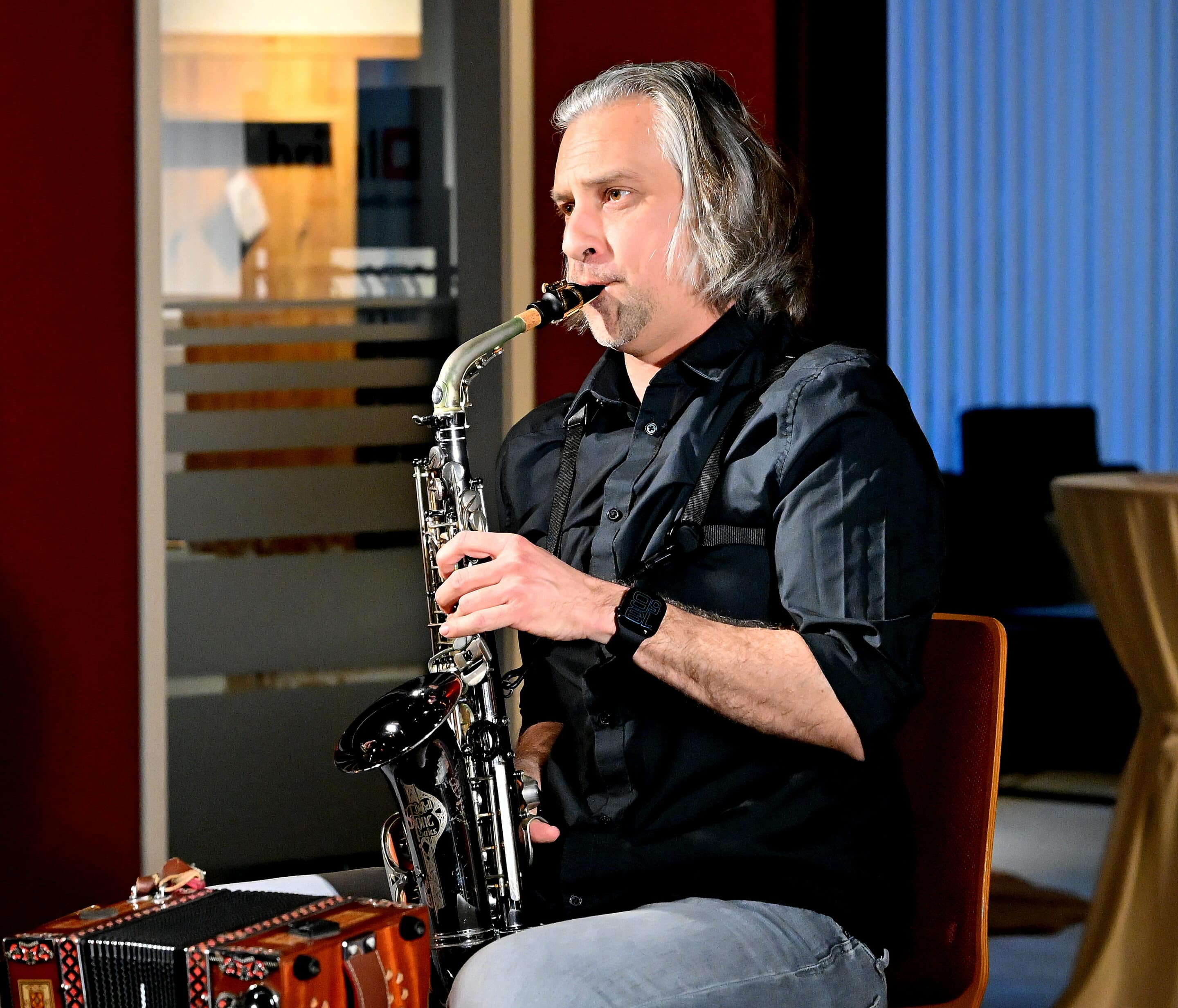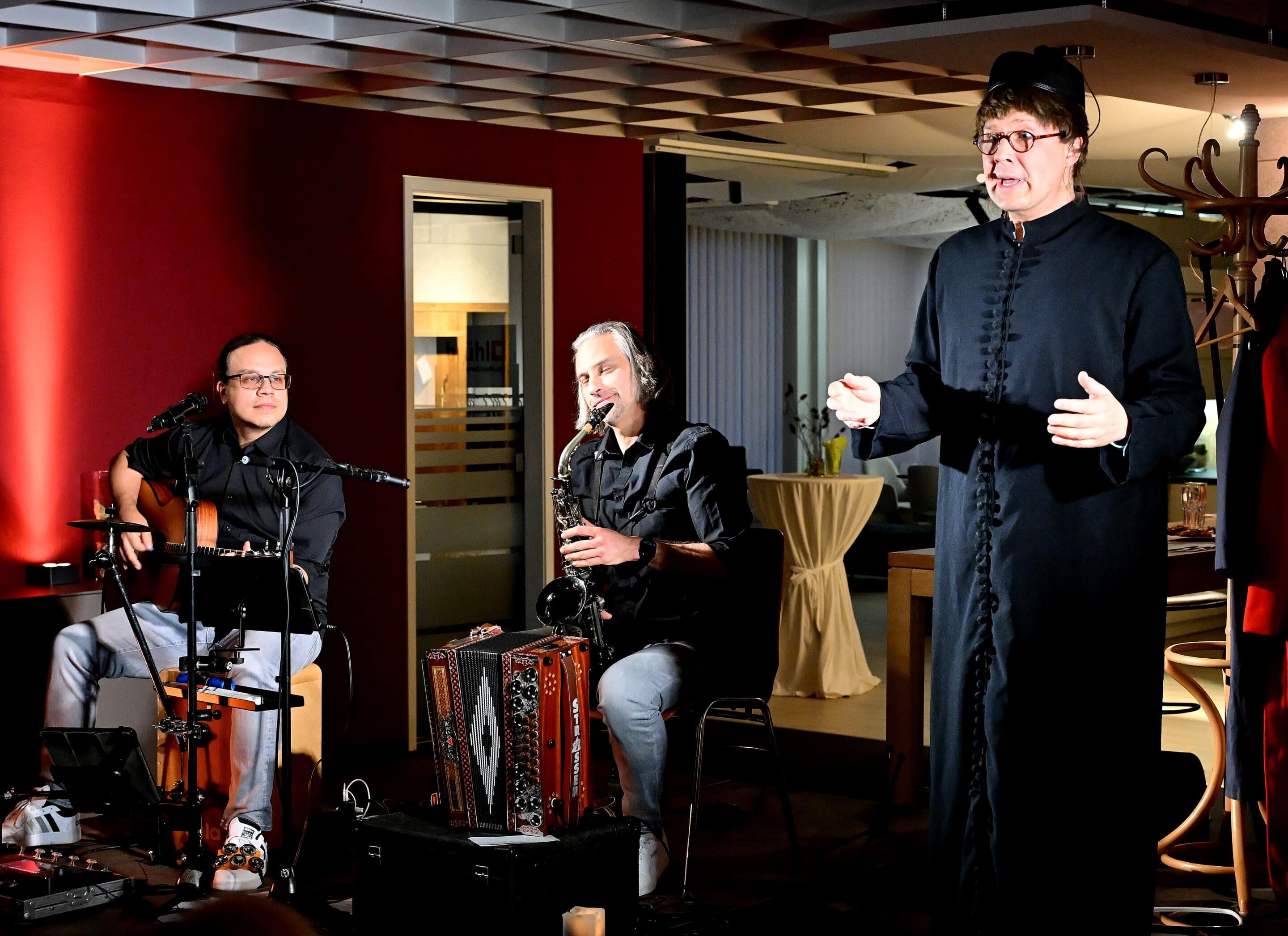 Top-Parodist Gernot Haas überzeugte mit seinem pointierten Programm, schlüpfte in zahlreiche Rollen prominenter Zeitgenossen und punktete mit faszinierend spontanem Wortwitz. Musikalisch souverän begleitet wurde das Show-Programm durch Daniel Kukovetz auf Sax und Steirischer Harmonika sowie Stefan Putzinger auf der Gitarre.