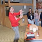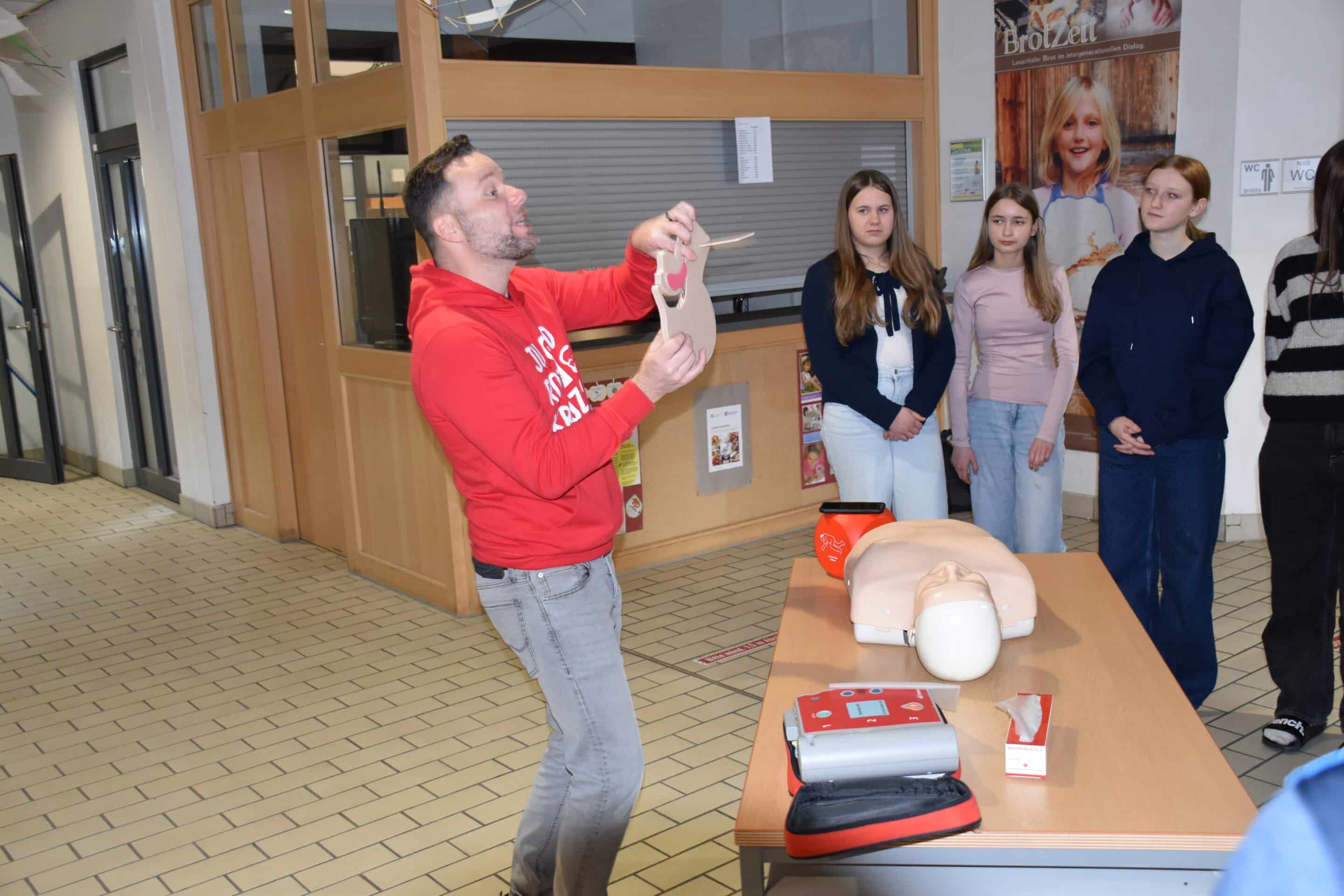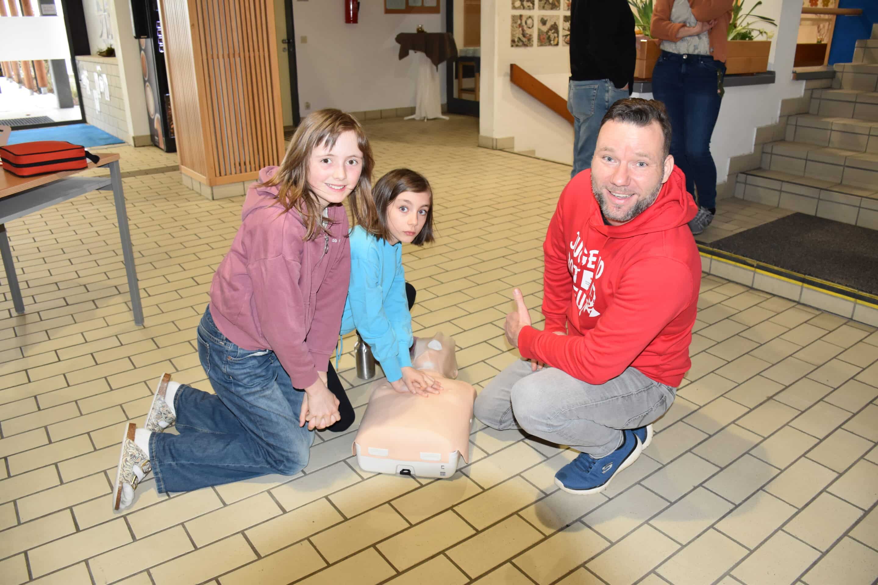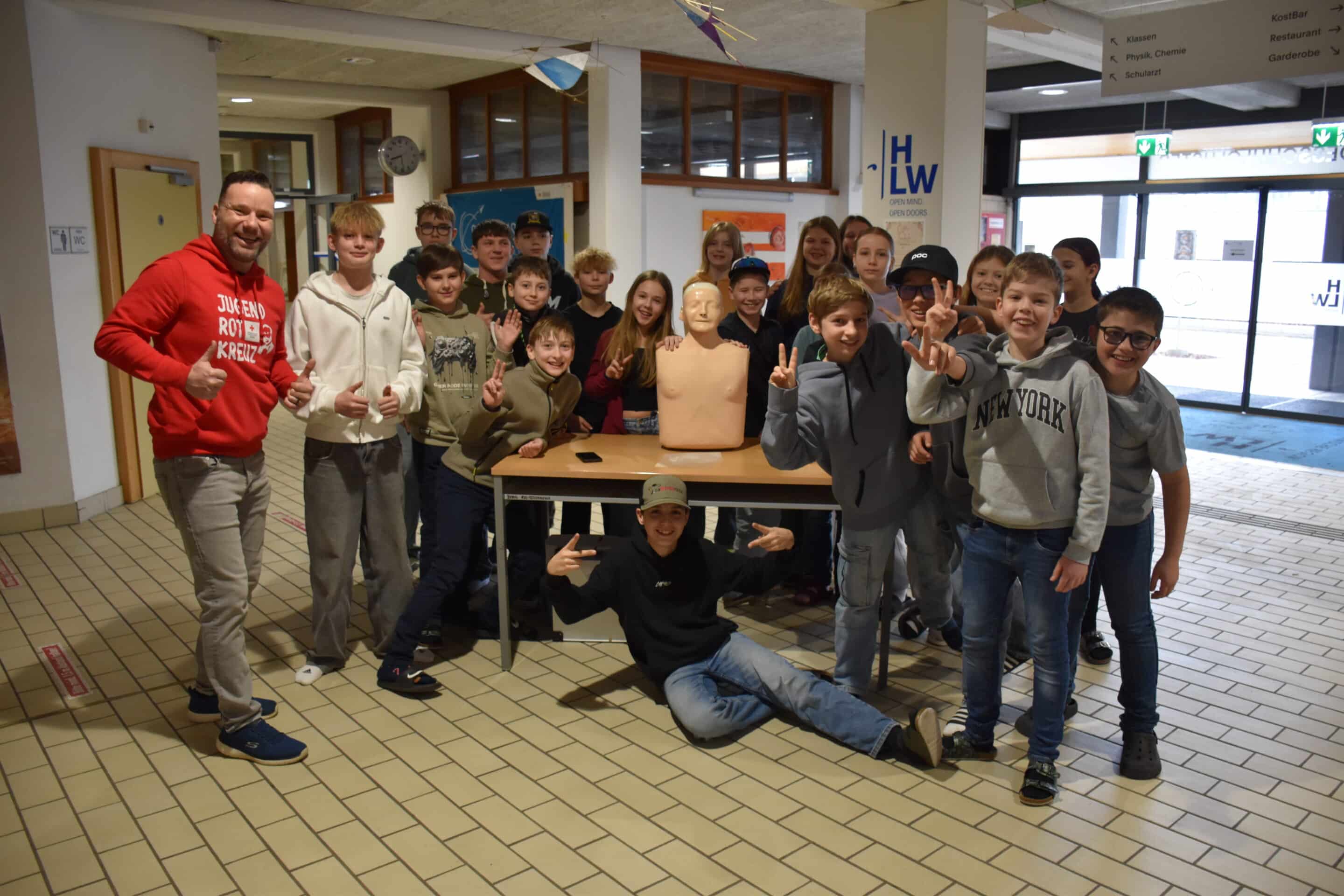 An einer Station konnten die Jugendlichen an einer Übungspuppe (Reanimationspuppe) selbst ausprobieren, wie eine Herzdruckmassage sowie die Mund-zu-Mund-Beatmung richtig durchgeführt werden – eine wichtige Erfahrung für den Ernstfall.