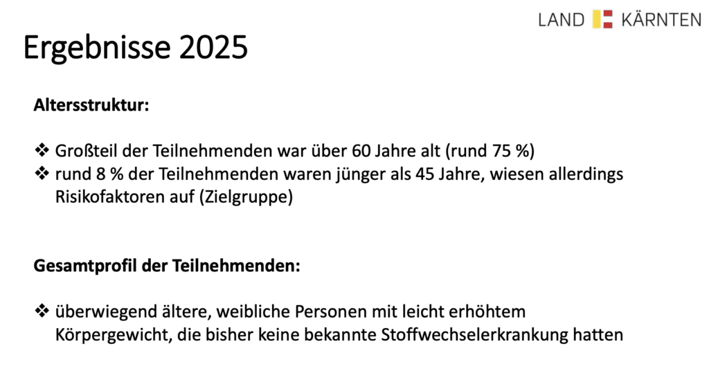 „Das große Interesse beweist, dass Gesundheitsvorsorge in Kärnten ernst genommen wird. Knapp 5.600 Menschen haben das kostenlose Angebot genutzt – und bei knapp 35 Prozent von ihnen konnte ein auffälliger Wert festgestellt werden. Das bedeutet: Hier kann man nun frühzeitig reagieren, bevor Folgeschäden entstehen, erklärt Die Gesundheitsrätin. Laut Auswertung der diesjährigen Aktion wurden 1.640 Prädiabetes-Fälle (29,4 %) und 296 Diabetes-Fälle (5,3 %) unter den Teilnehmenden festgestellt. „Der Großteil der Teilnehmenden wusste gar nicht, dass sie bereits ein erhöhtes Risiko haben. Genau dafür ist diese Aktion da – um frühzeitig zu erkennen, zu informieren und rechtzeitig gegenzusteuern“, betont Prettner.