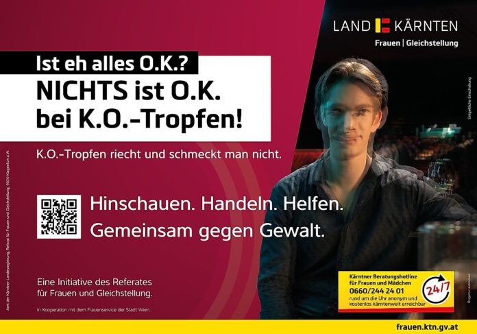 „K.O.-Tropfen sind ein massiver Eingriff in die körperliche und seelische Unversehrtheit eines Menschen“, erklärt Frauen- und Gleichstellungsreferentin LHStv.in Gaby Schaunig. Auch wenn Frauen besonders häufig betroffen sind, kann diese Form von Gewalt jeden treffen, auch Männer. Die Verantwortung liegt immer beim Täter, betont Schaunig. Viele Betroffene zweifeln jedoch an sich selbst oder schämen sich für etwas, das ihnen angetan wurde. Offene Gespräche über das Thema, der Abbau von Schamgefühlen und der rasche Zugang zu Unterstützung sind deshalb entscheidend. Die Kampagne setzt daher auf umfassende Informationen, Prävention und ein dichtes Netz an kostenlosen, anonymen Anlaufstellen, damit alle Menschen, die Hilfe brauchen, sie auch finden können.