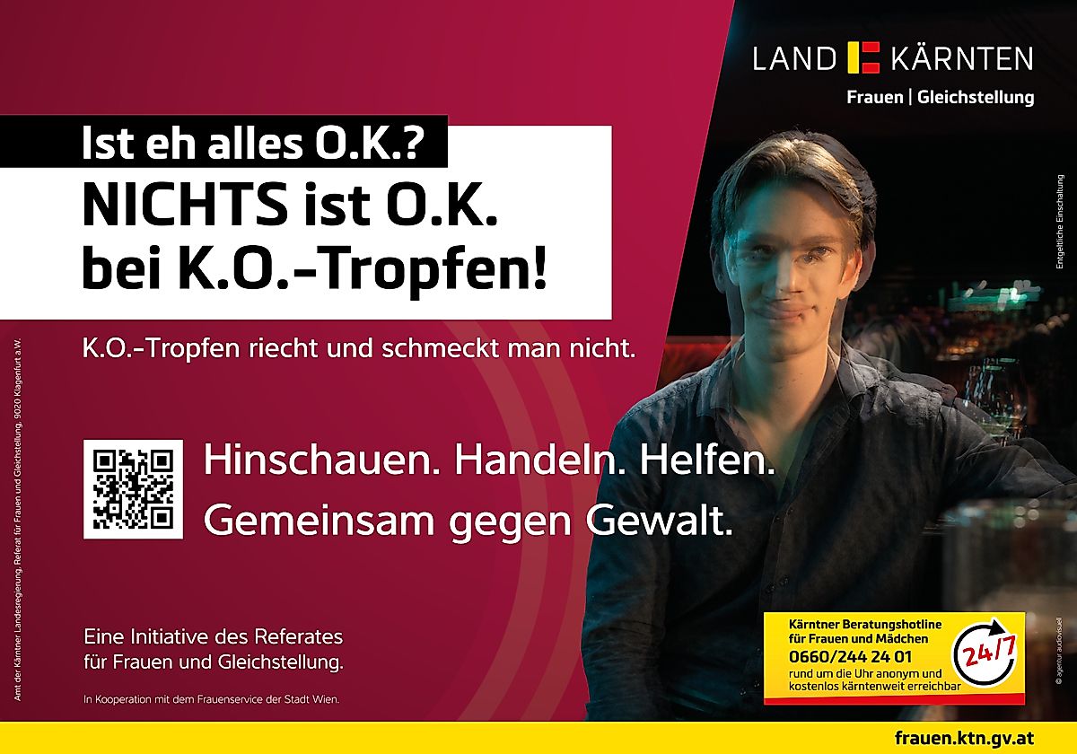 Die Initiative verfolgt das Ziel, die Bevölkerung für die Gefahren von K.O.-Mitteln zu sensibilisieren, Zivilcourage zu fördern und konkrete Informationen für den Schutz von Betroffenen bereitzustellen. Die Kampagne basiert auf einem erfolgreichen Projekt des Frauenservice Wien und wird nun gemeinsam in Kärnten umgesetzt. Sichtbar wird die Initiative unter anderem durch Plakate im öffentlichen Raum, begleitende Social-Media-Maßnahmen, eine neue Landingpage mit detaillierten Informationen sowie eine E-Mail-Aussendung an Gemeinden, Bildungseinrichtungen und bestehende Netzwerke. Auf diese Weise sollen sowohl die breite Öffentlichkeit als auch direkt Betroffene erreicht werden, um Bewusstsein zu schaffen, Schutzmaßnahmen zu verbreiten und Hilfsangebote bekannt zu machen.