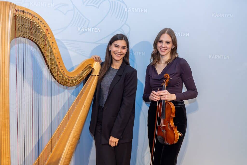Bei den Ehrungen anwesend waren auch die Bürgermeister Günther Vallant (Frantschach-St. Gertraud) und Günther Albel (Villach) sowie der stellvertretende Landesamtsdirektor Markus Matschek. Für die musikalische Umrahmung sorgten Hannah Senfter (Harfe) und Polina Winkler (Geige).