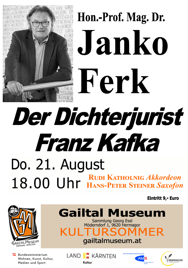 Unter dem Titel „Der Dichterjurist Franz Kafka“ lädt das Gailtalmuseum am Donnerstag, 21. August 2025, um 18 Uhr zu einem hochkarätigen Literaturabend mit Musik. Der renommierte Schriftsteller und Jurist Janko Ferk beleuchtet in seinem Vortrag Leben und Werk seines weltberühmten Kollegen Franz Kafka – aus der einzigartigen Perspektive eines „Dichterjuristen“.