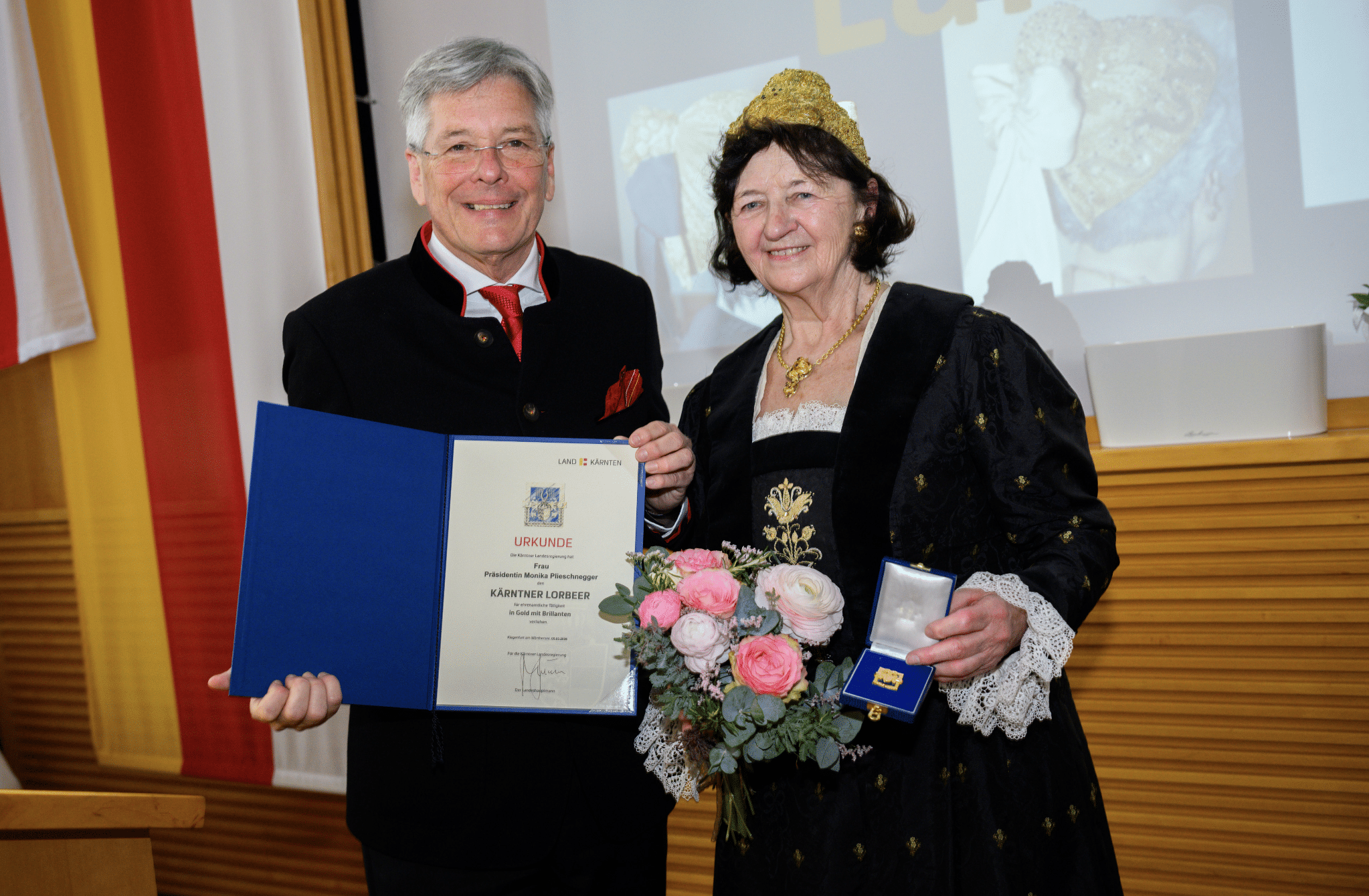Für ihre über 60-jährige ehrenamtliche Tätigkeit wurde Landesobfrau Monika Plieschnegger mit dem Kärntner Lorbeer in Gold mit Brillanten ausgezeichnet. Die anwesenden Goldhaubenfrauen ehrten diese besondere Würdigung mit Standing Ovations.