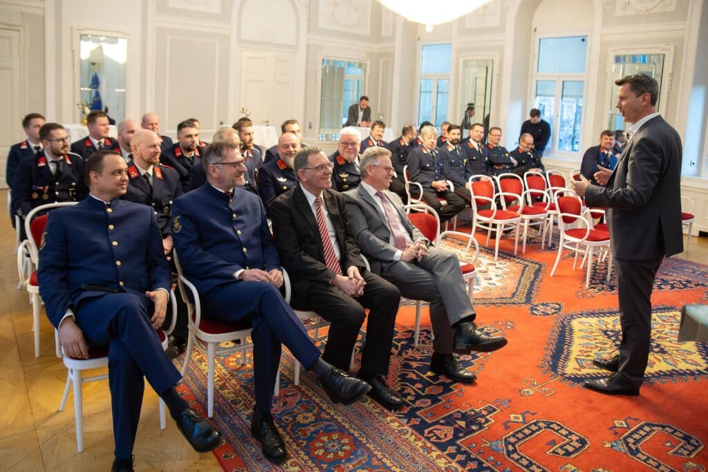 Landesrat Fellner würdigte in seiner Ansprache den großen Einsatzwillen der Einsatzkräfte: „Katastropheneinsätze verlangen euch, unseren Einsatzkräften in Kärnten, körperlich und mental alles ab. Diese Medaille soll ein sichtbares Zeichen unserer Dankbarkeit für euer selbstloses Engagement und zugleich unsere Wertschätzung ausdrücken und zeigen, dass euer Einsatz gesehen und geschätzt wird.“ Besonders hob Fellner die Rolle des Ehrenamtes hervor: „Wenn andere Schutz suchen, rücken unsere Einsatzkräfte aus. Sie lassen Familie und Freizeit zurück, um Menschen zu helfen. Dieses Verantwortungsgefühl ist keine Selbstverständlichkeit, es ist vielmehr Ausdruck gelebter Solidarität in Kärnten.“