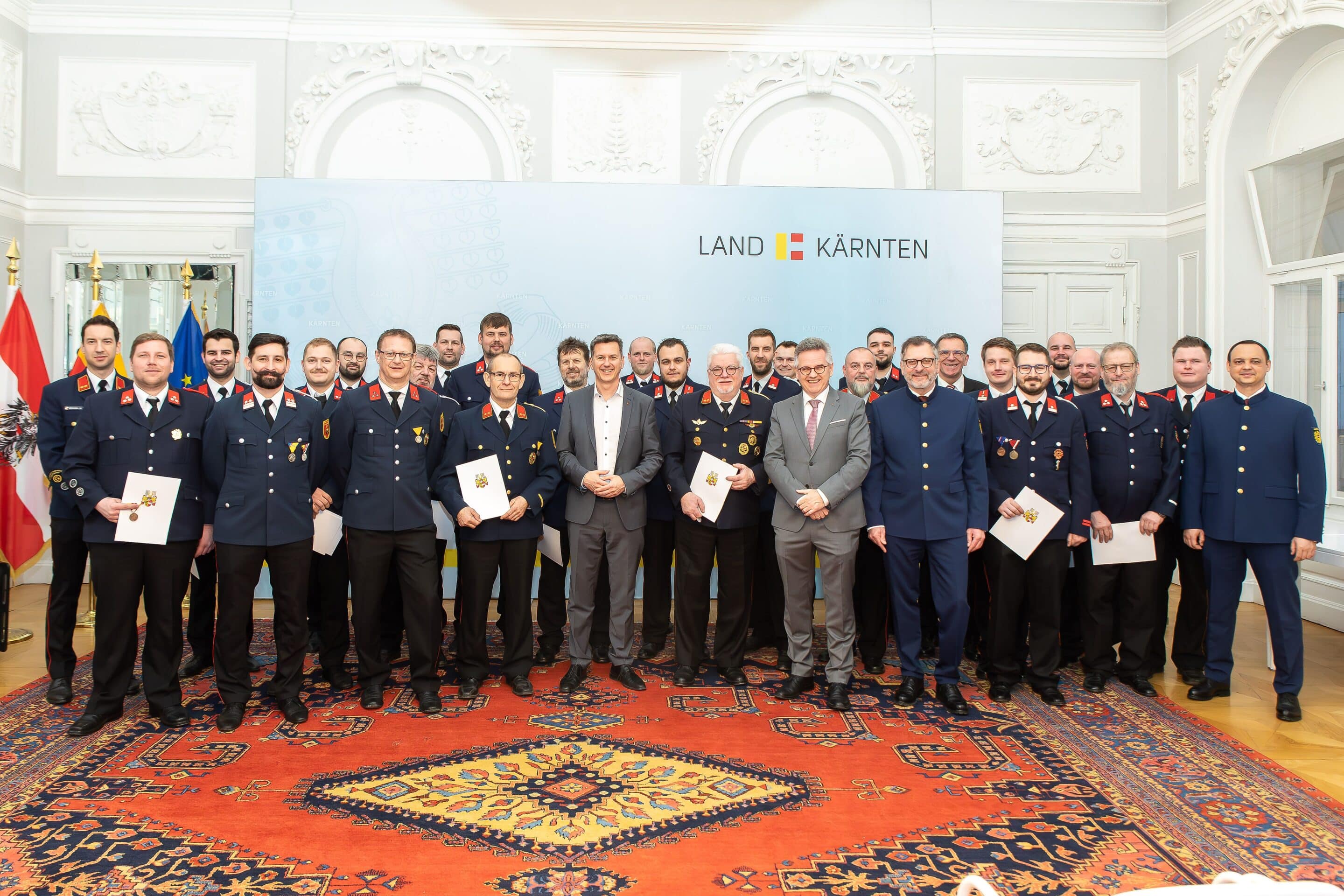 Fellner unterstrich zudem die Bedeutung der kontinuierlichen Unterstützung der Einsatzorganisationen: „Die Sicherheit der Kärntnerinnen und Kärntner ist eine gemeinsame Aufgabe. Dafür brauchen wir engagierte Menschen und die bestmöglichen Rahmenbedingungen für ihre wichtige Arbeit. Mein Dank gilt jeder einzelnen geehrten Person und allen, die tagtäglich für unsere Sicherheit bereitstehen.“ Geehrt wurden Mitglieder der Freiwilligen Feuerwehren Villach-Möltschach, Gotschuchen, Reintal, Jadersdorf, Fellach und Flattach-Fragant. Die Geehrten standen bei Hochwasser-, Sturm- und Unwettereinsätzen sowie weiteren Krisenlagen im Einsatz und leisteten wertvolle Hilfe für die Bevölkerung. Sie erhielten die Katastrophenschutz-Medaillen in Silber (13) und Bronze (12).