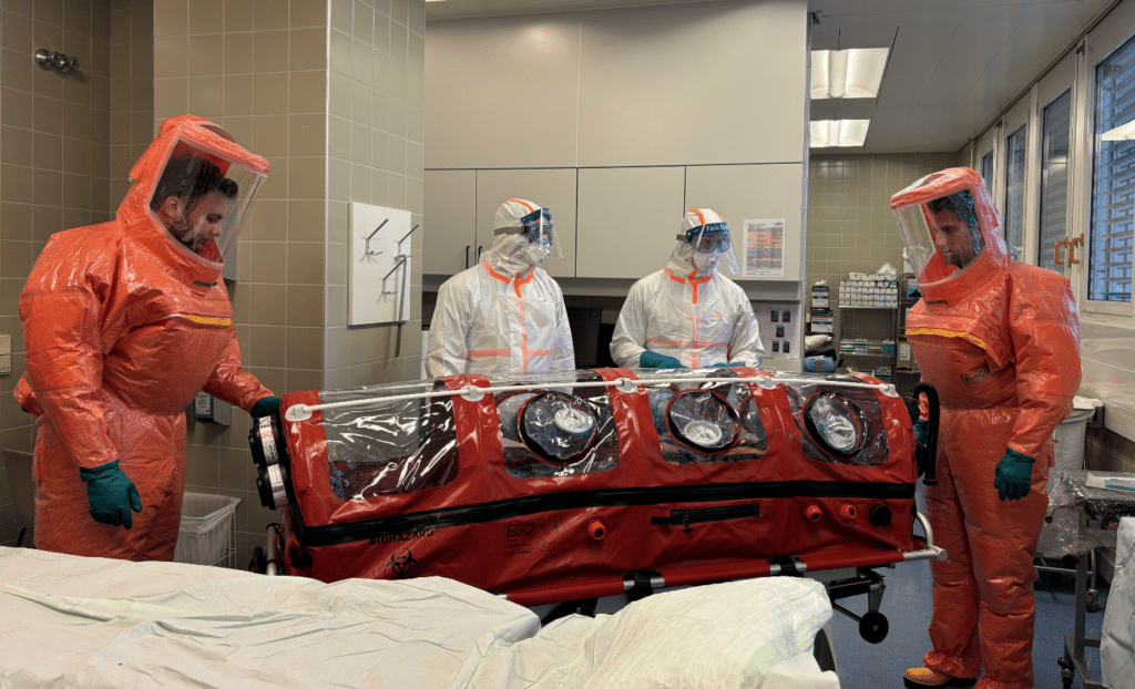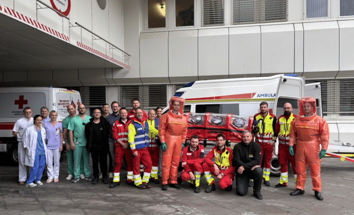 Im Verlauf der Erstversorgung ergaben sich Hinweise auf einen Aufenthalt in der Demokratischen Republik Kongo in Zentralafrika, wo der 35-Jährige in einem Dschungelkrankenhaus als Volunteer tätig gewesen war, indem auch Ebola-Patienten behandelt wurden. „Ab diesem Zeitpunkt mussten wir von einer hochkontagiösen Infektion ausgehen“, erklärt Übungsleiter DGKP Johannes Engl. Sofort wurden die vorgesehenen Schutz- und Alarmmaßnahmen aktiviert. Der betroffene Bereich wurde abgesperrt, die Versorgung unterbrochen und das unmittelbare Umfeld geräumt. Obwohl es für einen unbeteiligten Beobachter dramatische Szenen sein mussten, handelte es sich dieses Mal nur um eine Übung.