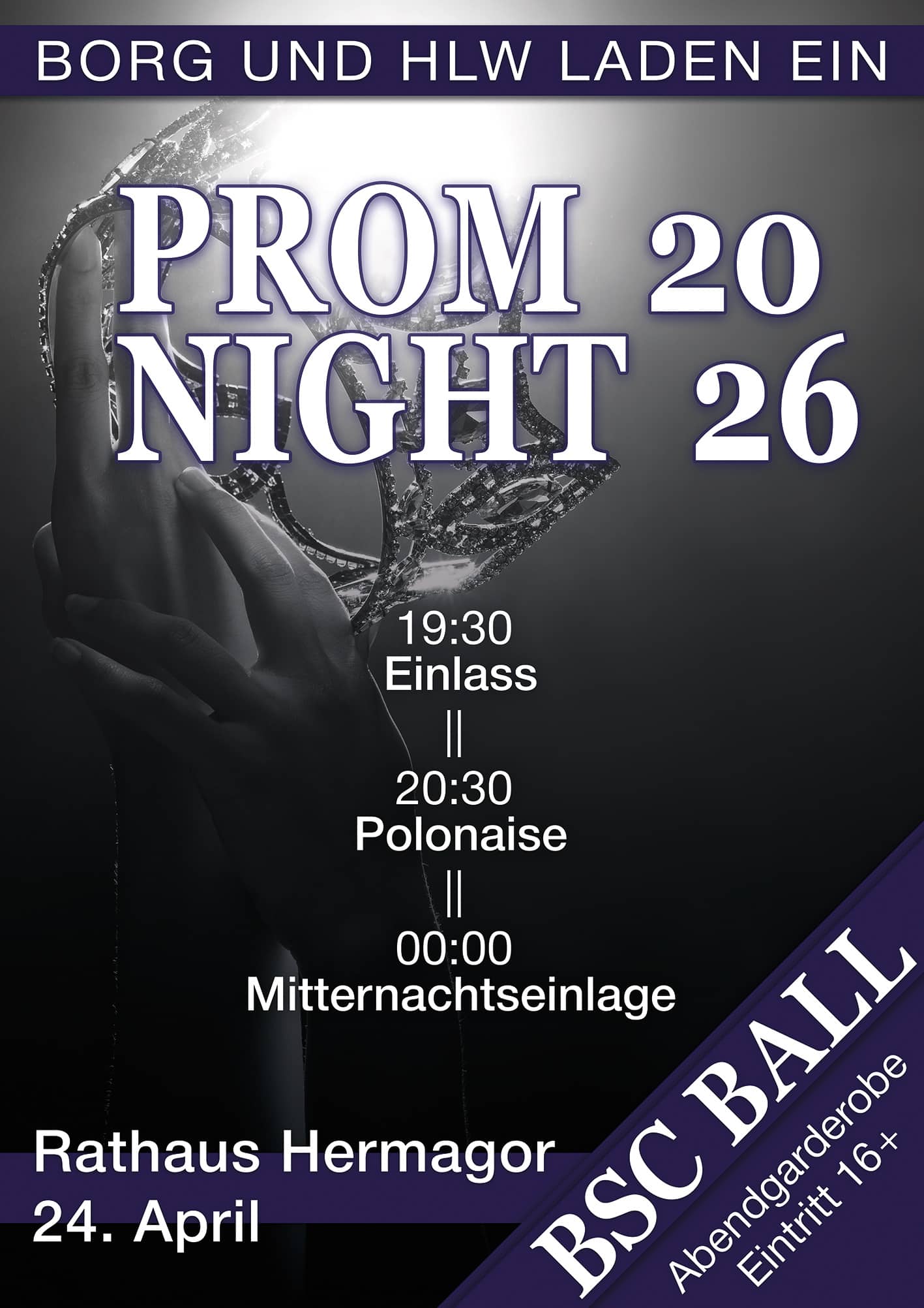 Am 24. April 2026 laden die 8. Klassen des BRG/BORG und die 5. Klasse der HLW zum traditionellen und extravaganten BSC Ball in die Stadtsäle von Hermagor. Im Keller rockt die Antenne Kärnten Disco, im großen Rathaussaal garantiert die Black & White Band für chillige Tanzrhythmen. Nach der bezaubernden Polonaise der Maturant:innen, einstudiert mit der Dance Factory, werden bei der Tombola coole Preise verlost!