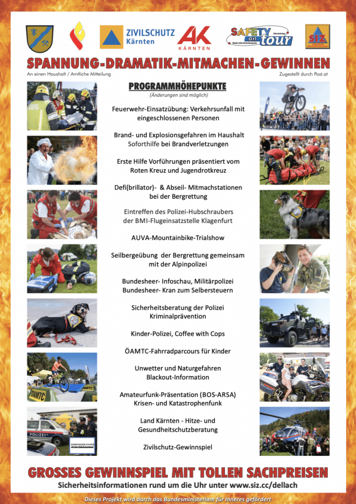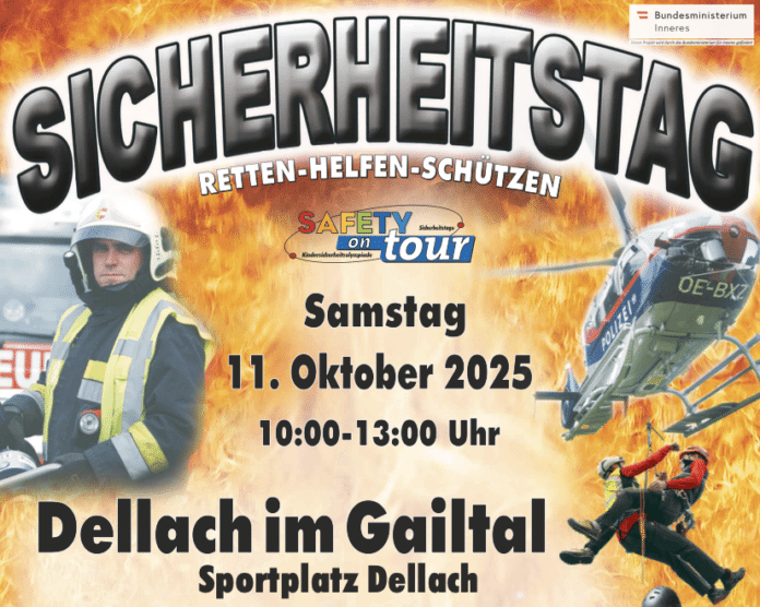 Hautnah miterleben kann man Einsatzübungen der Feuerwehr, des Roten Kreuzes mit dem Jugendrotkreuz, der Österreichischen Rettungshundebrigade, sowie der Bergrettung gemeinsam mit der Alpinpolizei. Insgesamt werden nicht weniger als 12 Organisationen beim Sicherheitstag in Dellach mitwirken. Es gibt eine großangelegte Fahrzeug- und Geräteschau der teilnehmenden Organisationen und auch eine große Infoschau des Österreichischen Bundesheeres.