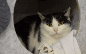 Der junge Kater „Raban“ (männlich kastriert, schwarz-weiß, geboren 2025) ist derzeit noch sehr zurückhaltend und lässt sich nicht anfassen. Er braucht viel Zeit und Geduld, um Vertrauen zu Menschen aufzubauen. Andere Katzen geben ihm Sicherheit, weshalb er diese Gesellschaft sehr schätzt. Ein Zuhause mit katzenfreundlichem Umfeld sowie der Möglichkeit zu Freigang in einem ruhigen Garten wäre für ihn ideal.