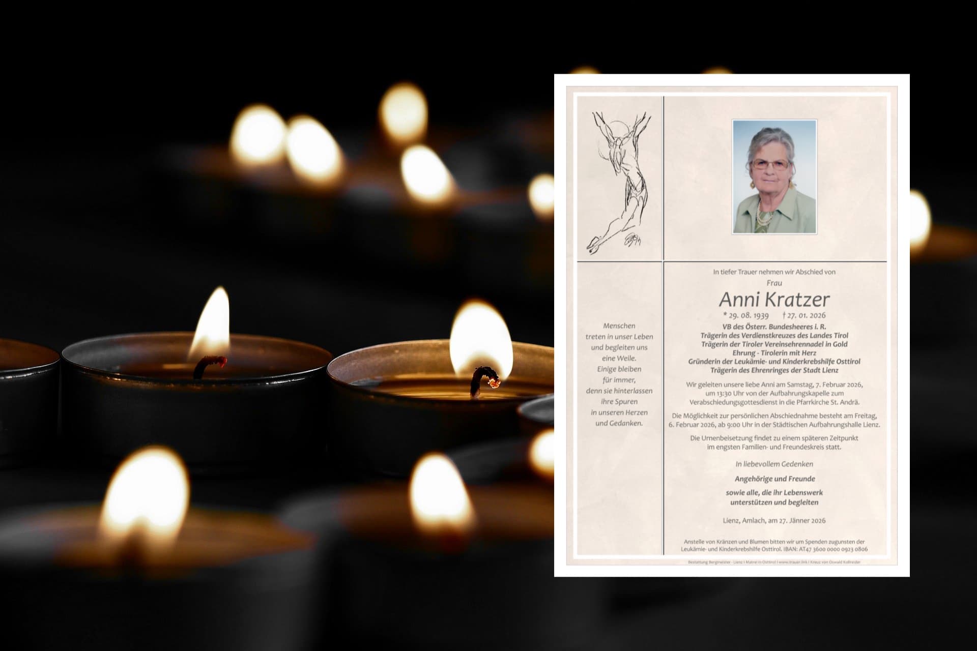 Nach dem Ableben von Anni Kratzer herrschte große Betroffenheit. Viele Menschen zeigten ihre Dankbarkeit für ihr Lebenswerk und ihren unermüdlichen Einsatz. Zahlreiche Familien in Osttirol haben durch ihre Zuversicht, ihr Mitgefühl und ihren Glauben an Genesung und Heilung Mut und Hoffnung erfahren, schreibt jemand.