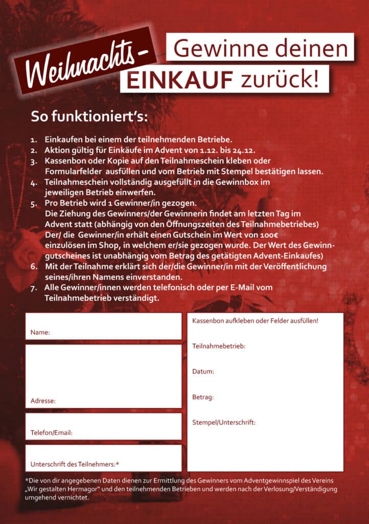 In der Zeit von 1. bis 24. Dezember 2025 läuft in rund 50 Betrieben der Bezirkshauptstadt Hermagor ein großes Advent-Gewinnspiel, bei dem pro teilnehmendem Betrieb je ein Einkaufsgutschein im Wert von je 100,- Euro unter den Teilnehmern verlost wird.