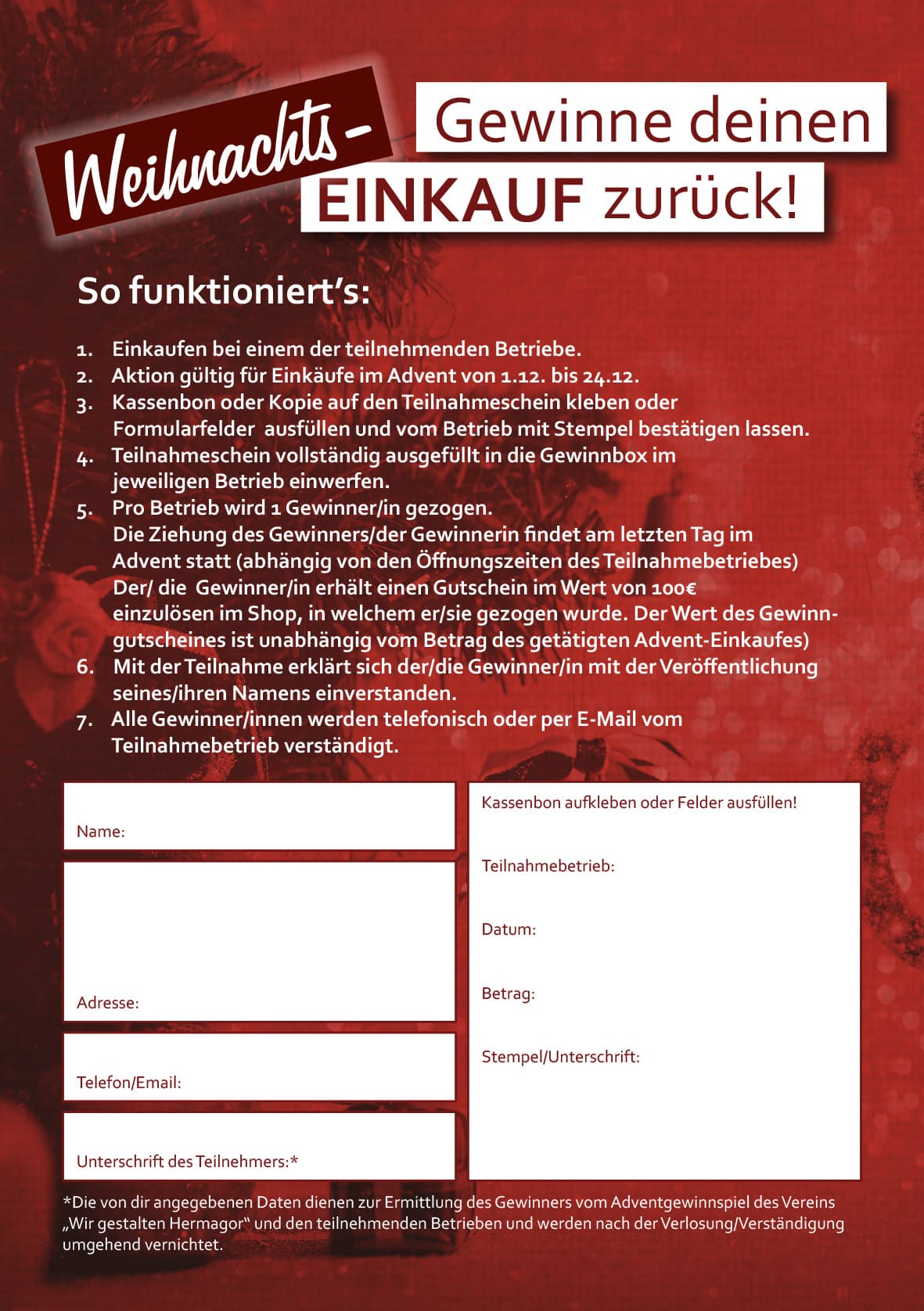 Jeder, der im Dezember in einem der teilnehmenden Geschäfte einkauft, erhält ein Teilnahmelos. Dieses wird in die Gewinnbox des jeweiligen Betriebs eingeworfen – und mit etwas Glück wird genau dieses Los gezogen!