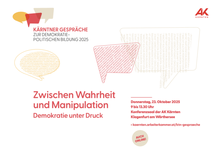 Unter dem Titel „Wahrheit und Manipulation – Demokratie unter Druck“ lädt die Arbeiterkammer Kärnten am Donnerstag, den 23. Oktober, zu den „Kärntner Gesprächen zur demokratiepolitischen Bildung“ ein. Von 9 bis 13:30 Uhr beleuchten namhafte Expert:innen im Konferenzsaal der AK Kärnten aktuelle Demokratiediskurse aus unterschiedlichen Blickwinkeln und schaffen eine Plattform für einen fundierte Austausch. Philosoph, Historiker und Journalist Philipp Blom sowie Kommunikationswissenschaftlerin Sophie Lecheler beleuchten die aktuellen Herausforderungen der Demokratie. Während Blom demokratiepolitische Veränderungsprozesse in den Blick nimmt, analysiert Lecheler die Rolle digitaler Medien. Eine besondere Note bringt Kabarettist Hosea Ratschiller ein. Mit seinem kritischen Humor zeigt er, wie Satire als Werkzeug für Kritik und Aufklärung genutzt werden kann. Gemeinsam bieten die Expert:innen eine vielseitige Betrachtung von Wahrheit, Manipulation und der Zukunft der Demokratie.