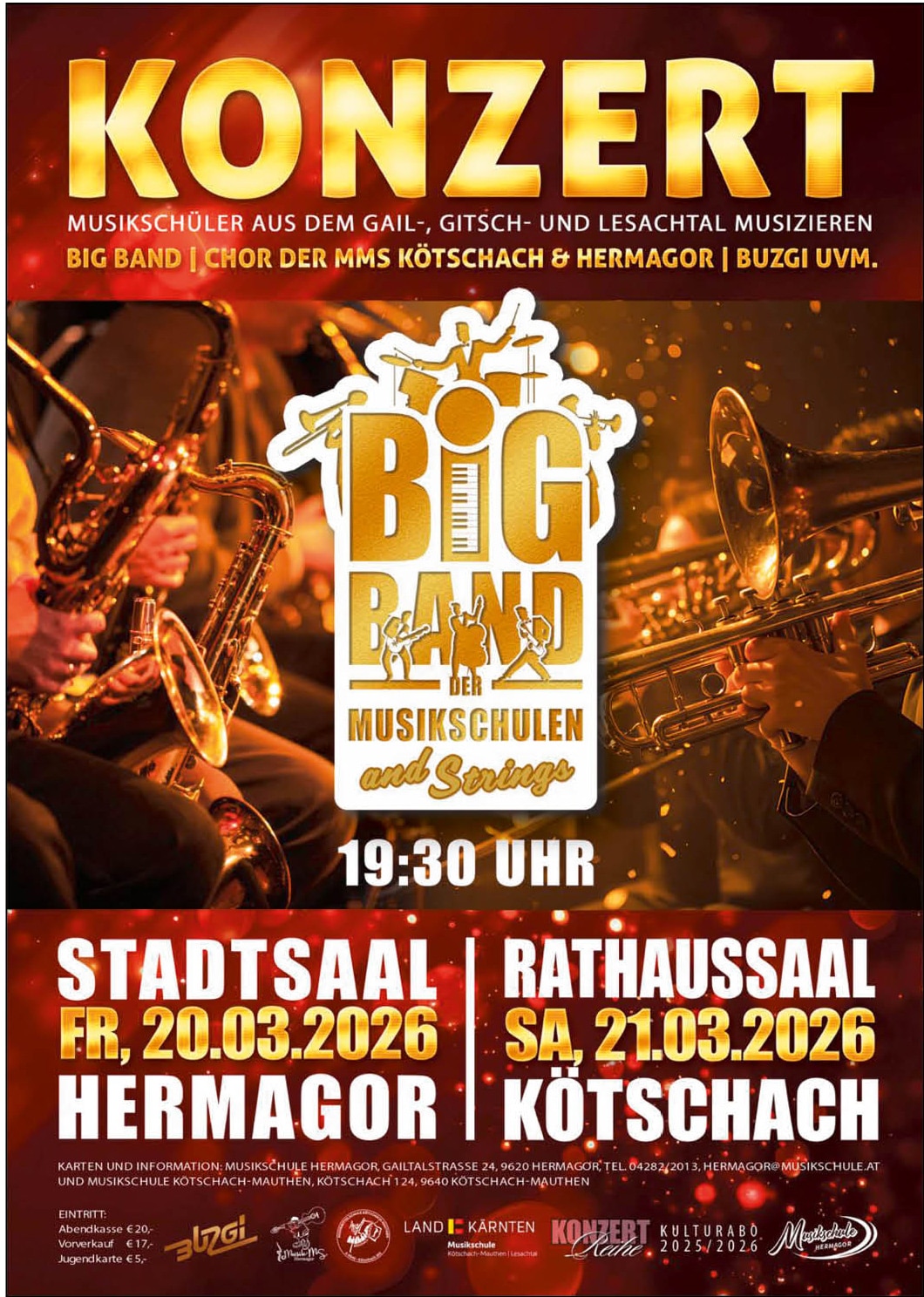 Die BIG BAND vereint Musikerinnen und Musiker aus dem gesamten Gail-, Gitsch- und Lesachtal und steht für musikalische Vielfalt auf hohem Niveau. Das Publikum darf sich auf ein abwechslungsreiches Programm freuen, das Swing-Klassiker, Pop-Hits und bekannte Melodien aus Musical und Unterhaltungsmusik umfasst.