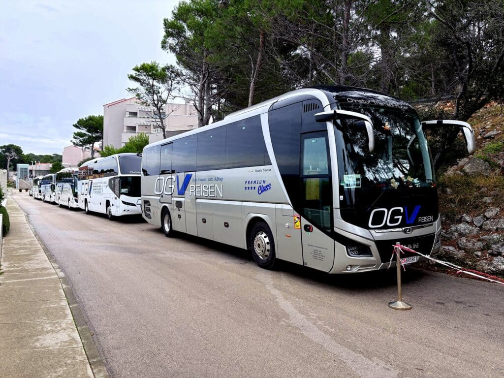 In insgesamt sieben modernsten Komfort-Reisebussen wurden die Teilnehmer am frühen Donnerstag-Morgen durch langjährig erfahrene Piloten problemlos und verlässlich vom Gailtal und Großraum Villach in ihr ca. 380 km entfernte Urlaubsquartier nach Veli Losinj und wieder nach Hause gebracht. Eine logistische Spitzenleistung für Office und Crew, wenn man bedenkt, dass es zahlreiche verschiedene Zu- und Ausstiegs-Punkte gibt. Darüber hinaus auch die Tatsache, dass im Vorfeld geklärt werden muss, wann welcher Bus mit welcher Fähre vom Festland auf die Insel und zurück kommt.