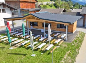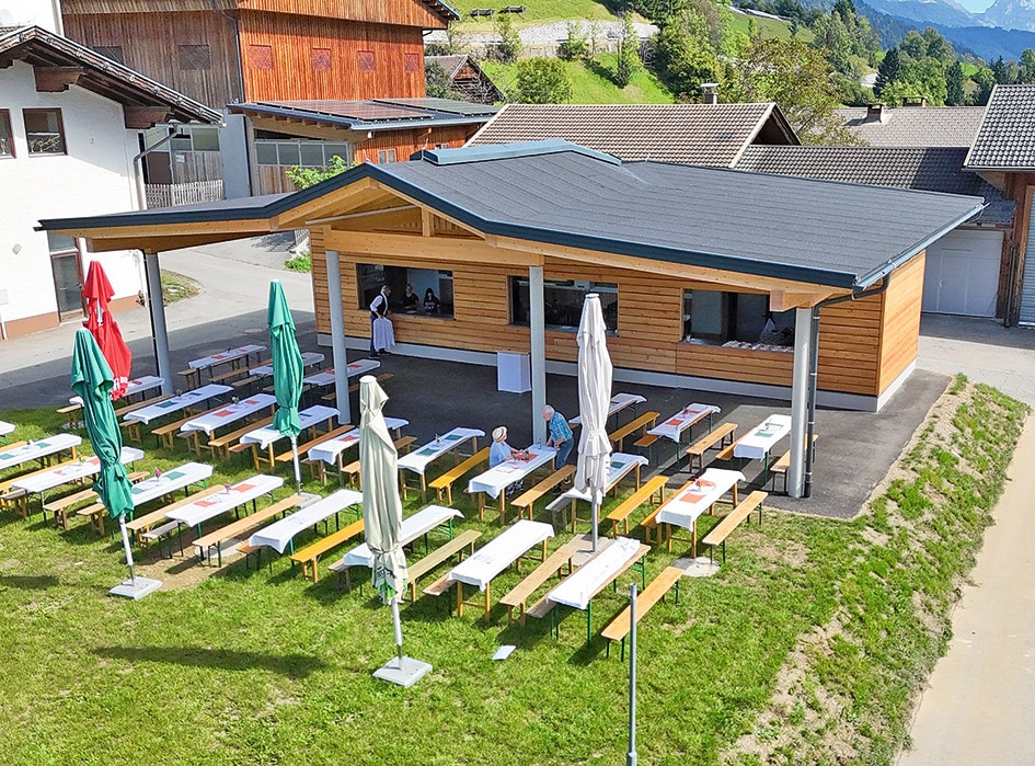 Der langgestreckte rechteckige Baukörper mit insgesamt 216 m² Dachfläche ist weitestgehend eine Holzkonstruktion, bestehend aus gedämmten Riegelwänden mit Sichtschalung an der Außen- und Innenseite. Darüber liegt eine flach geneigte Satteldach-Struktur, bestehend aus BSH-Pfetten und BSH-Sparren. Die Architektur der zusätzlichen First-Auffaltung orientiert sich an der charakteristischen Bauweise der Gebirgsregion Lesachtal. Der Bereich Ausschank, ca. 50 m² groß, steht auf einer Stahlbeton-Fundamentplatte; die Dachlasten der sichtbaren Leimholz-Konstruktion werden über Stb-Rundsäulen abgetragen. Die Dacheindeckung ist ein dreilagiges Alpindach. Der ca. 80 m² große offene Außenbereich bietet Platz für etwa 100 Sitzplätze und ca. 50 Stehplätze. Dank der großartigen finanziellen Mithilfe der örtlichen Vereine und Nachbarschaften in Höhe von 55.800 Euro sowie wertvoller Eigenleistungen (ca. 900 Stunden) und der Landesförderung von 60.800 Euro wird das Gemeinde-Budget lediglich mit etwa 18.000 Euro belastet. Besonders hervorzuheben sind auch diverse Gratisleistungen der Firmen Erdbau Strasser, Transporte und Kranarbeiten Johann Huber, Abbrucharbeiten durch Transporte Christian Pichler und Holzbringung durch Bernhard Knotz.