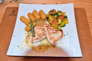 Manfred „Mani“ Stefaner ist ein Name, der aus der Gailtaler Gastronomie seit 20 Jahren nicht mehr wegzudenken ist. Seit gut einem Jahr steht er hier im Almhotel inmitten einer atemberaubenden Bergkulisse hinter dem Herd – gemeinsam mit seinem internationalen Küchenteam. Die Handschrift ist klar: Regionalität trifft Kreativität, Handwerk trifft Weltoffenheit. Viele Gäste kommen mittlerweile wegen Mani allein – und werden nicht enttäuscht. Neben internationalen Einflüssen stehen auch regionale Klassiker auf der Karte, mit Zutaten aus der unmittelbaren Umgebung. Ein absolutes Highlight: das Almhotel-Schnitzel, gefüllt mit Original Gailtaler Speck und Gailtaler Almkäse g.U. von der Watschiger Alm. Dazu gibt’s knackiges Gemüse und Kroketten, beliebt sind auch die Käsespätzle, Fischsalat und vieles mehr. Warme Küche durchgehend von 11:30 bis 16:00 Uhr und abends von 18:00 bis 20:00 Uhr.
