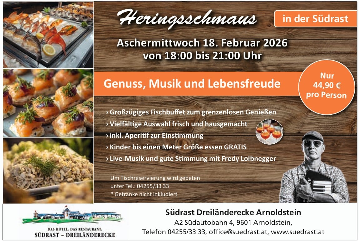 Die Südrast Dreiländerecke Arnoldstein ist seit Jahren ein Treffpunkt für Genießerinnen und Genießer, die Wert auf Qualität, Gastfreundschaft und ein stimmiges Ambiente legen. Mit dem Heringsschmaus setzt das Team auch 2026 wieder auf Tradition und kulinarisches Handwerk – ganz im Zeichen eines gemütlichen Abends, der Freude macht und Lust auf gute Küche weckt.