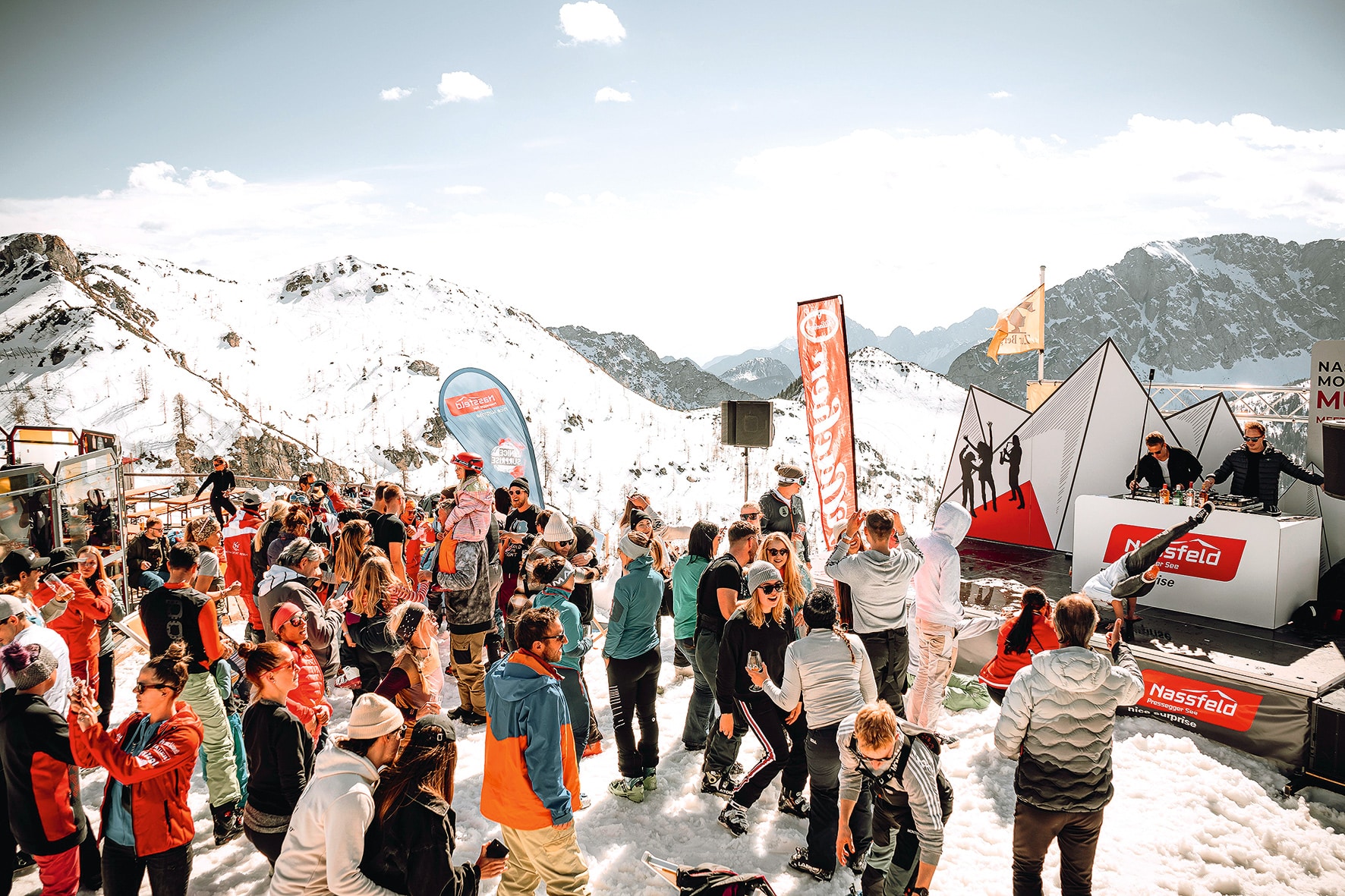 Sobald die Sonne kräftiger wird, verändert sich die Dynamik am Berg: Weg vom sportlichen Ehrgeiz, hin zum entspannten Mix aus knackigen Schwüngen am Vormittag und Chillmodus ab Mittag. Der beste Platz dafür sind die Sonnenterrassen am Nassfeld. Dort treffen bis zum Saisonende jedes Wochenende erstklassige Live-Musik auf kulinarische Schmankerln und ausgelassene Partystimmung.