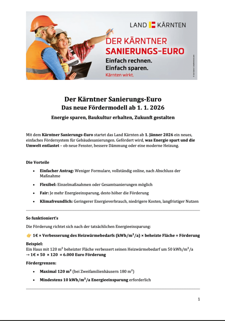 Neben dem neuen Sanierungs-Euro bleiben auch andere wichtige Förderinstrumente bestehen. Weiterhin unterstützt das Land Kärnten Maßnahmen im Bereich barrierefreies Wohnen, wenn ein konkreter Bedarf vorliegt. Hier werden bis zu 50 Prozent der Kosten gefördert. Für den Austausch fossiler Heizsysteme gibt es 3.000 Euro Basisförderung und zusätzlich 1.500 Euro Solarbonus. Auch der Erwerb von Altobjekten wird gezielt unterstützt: Beim Kauf eines bestehenden Einfamilienhauses beträgt die Förderung 15 % des Kaufpreises (maximal 25.000 Euro), bei Zweifamilienhäusern 22,5 % (maximal 37.500 Euro). Damit soll die Nutzung bestehender Gebäude gefördert und die Belebung der Ortskerne weiter vorangetrieben werden.