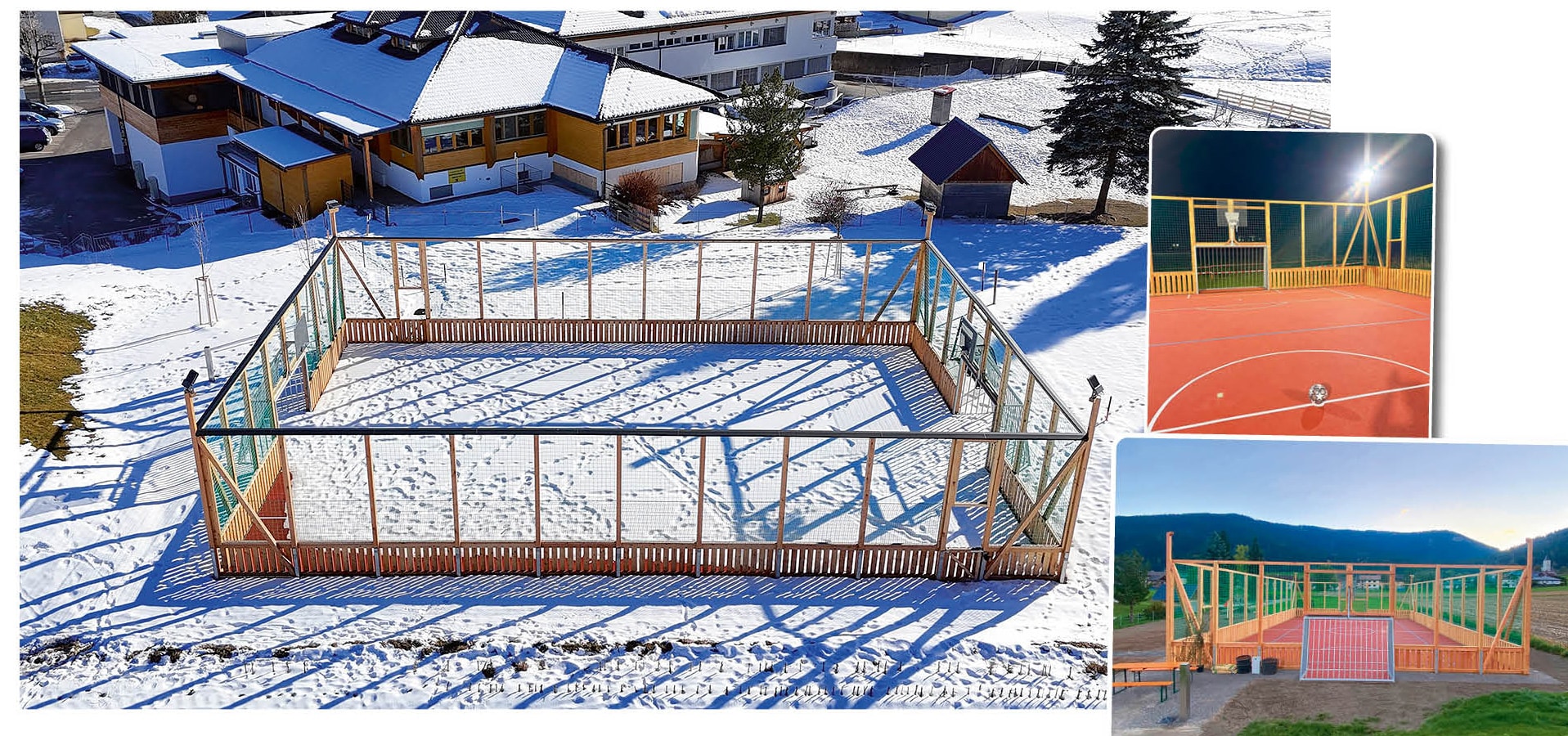 Projektleiter Arch. DI Roman Schmidt erklärt: „Die Multisportanlage mit der Platzgröße 13 x 20 Meter (260 m², 2 Metalltore, 2 Basketballkörbe) wurde im Zeitraum Ende Juli bis Anfang Oktober 2025 auf einer Dränbeton-Bodenplatte errichtet. Das ist eine praktische und beliebte Größe für vielseitige, kompakte Sportanlagen, die sich gut für den Nachwuchs- und Freizeitsport eignen. Daher habe ich im Vorfeld, zufolge meines sportlichen Hintergrundes, diese kompakte Größe vorgeschlagen. Sie ist optimal passend für Fußball, Volleyball, Basketball und Handball, aber auch für sämtliche anderen, nicht feldbezogenen Trainingsformen wie z. B. Yoga etc. Außerdem gibt es auch eine Flutlichtanlage mit Zeitschaltung. Auf dem Dränbeton wurde ein ca. 1 cm starker, elastischer roter EPDM-Belag verlegt, wie man ihn von Laufbahnen in Leichtathletikstadien kennt. Die Bandenanlage wurde aus Holz gefertigt, um den regionalen und natürlichen Charakter zu betonen. Über der Bandenanlage gibt es ein umlaufendes Fangnetz mit ca. 3 m Höhe sowie an den Ecken jeweils einen etwas erhöhten Flutlichtmasten. Vor der Multisportanlage wurde ein Ruheplatz mit Sitzmöbeln und einem Trinkbrunnen errichtet. Mit dem angefallenen Aushubmaterial wurde im Norden des Bewegungsparks ein kleiner Hügel modelliert. Dieser kann im Winter von den Kindern auch zum Rodeln genutzt werden.“