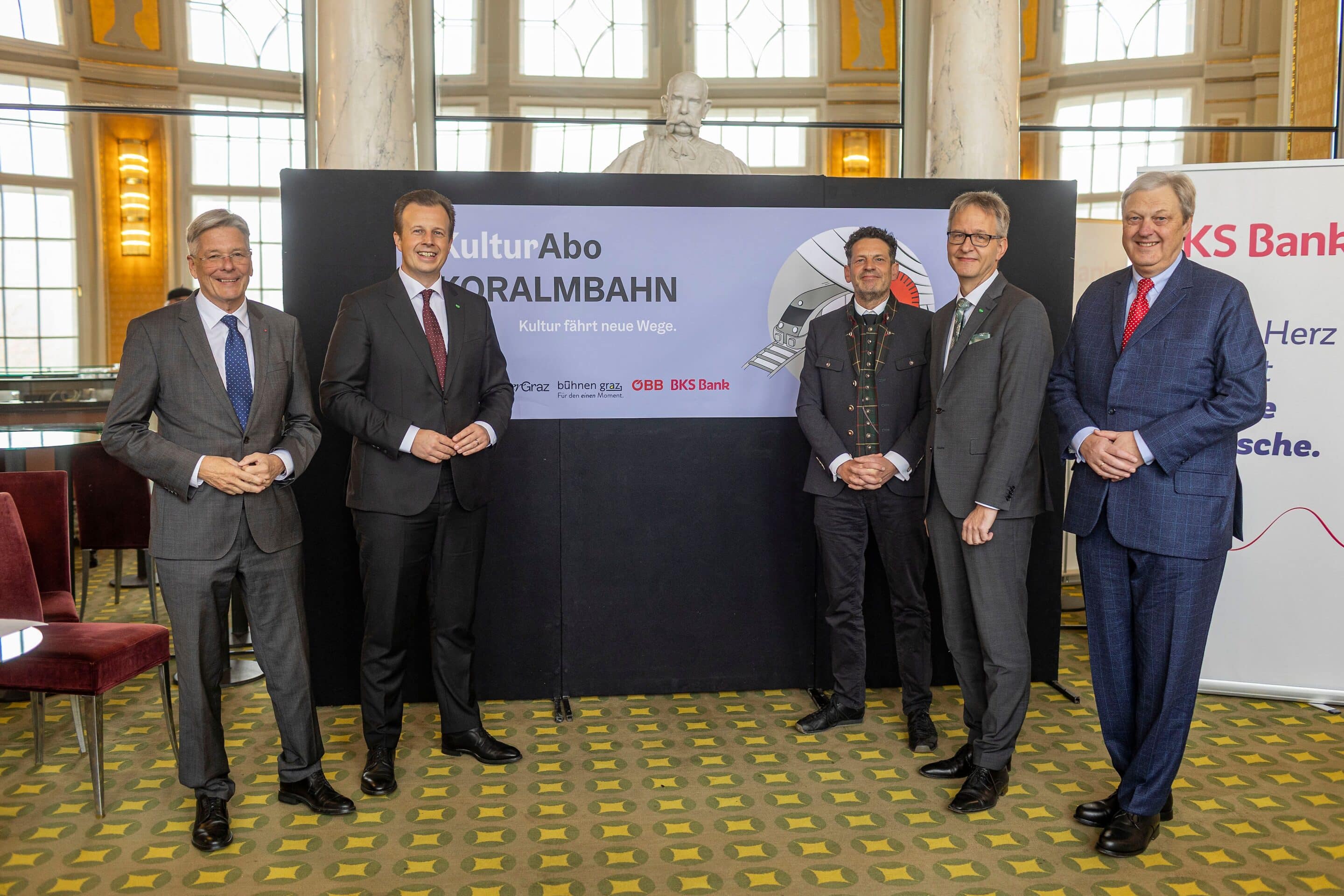 LR Karlheinz Kronhäusl bezeichnete die Inbetriebnahme der Koralmbahn als eine einmalige Chance für eine Kooperation im Bereich der Kultur. „Es war ein logischer Schritt, diese Jahrhundertchance zu nutzen um die Kulturregion Steiermark und Kärnten zu verbinden“, betonte Kornhäusl. Aron Stiehl, Intendant des Stadttheater Klagenfurt, zeigte sich überzeugt, dass „Koralmbahn KulturAbo“ die Menschen dies- und jenseits der Pack näher zu einander bringen wird. Ulrich Lenz, Intendant Oper Graz, präsentierte das Programm und betonte, dass vier Veranstaltungen zusammengeführt wurden, die zum Pendeln zwischen den Städten animieren. Nikolaus Juhász der Vorstandsvorsitzende der BKS-Bank, die mit ihrem Engagement ermöglicht, dass die Fahrtkarten mit der Koralmbahn und den öffentlichen Anbindungen zwischen den Bahnhöfen und Stadttheater bzw. Oper im Preis der jeweiligen Eintrittskarte beinhaltet sind, bezeichnet das „Koralmbahn KulturAbo“ als ein Herzensprojekt, das seitens des Geldinstitutes gerne unterstützt wird.